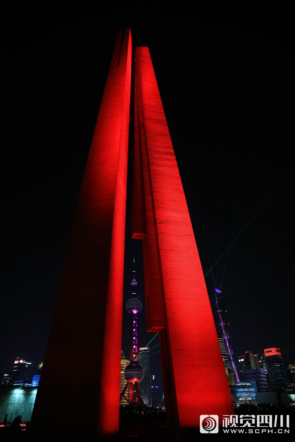 绚丽灯光映射下的上海市人民英雄纪念塔与东方明珠