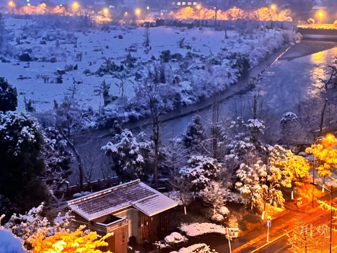 1月14日晚,成都都江堰市区的积雪。摄影:关利沙
