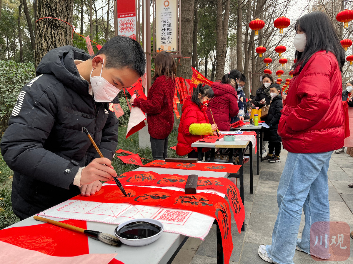 此次活动由成都市文学艺术界联合会、成都市公园城市建设管理局、四川日报全媒文体新闻中心、四川省艺术院主办。自启动以来,共有400多位来自成都市中小学的青少年书法爱好者提交作品报名参与,经选拔后共有100余人来到活动现场。在特邀导师钟杨琴笙、赵安如、王骥、何晓魏、郭政权、洪岭、汪邦军、曹华、王红梅、何玉婷的带领下,小书法家们现场挥毫泼墨,为广大市民、游客写下一幅幅承载美好祝福的春联、福字。