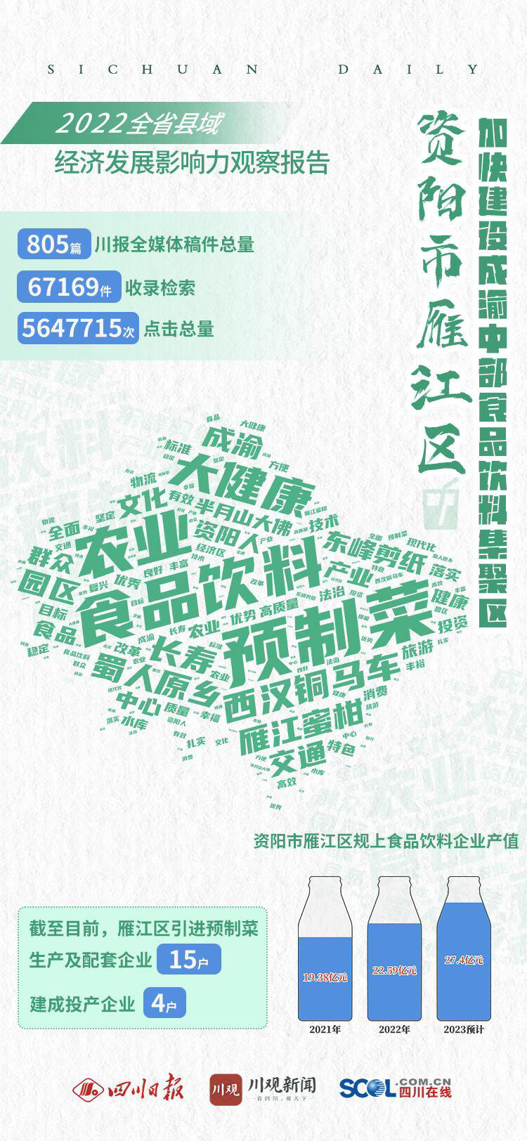 近日,川观新闻推出《2022全省县域经济发展影响力观察报告·资阳市雁江区》,通过川报全媒体后台大数据统计,去年一年,川报全媒体共刊发雁江区相关稿件805篇,收录检索67169件,点击总量达5647715次。梳理这一年川报全媒体对雁江区的相关报道发现,“预制菜”“食品饮料”“大健康”“农业”等成为高频关键词。