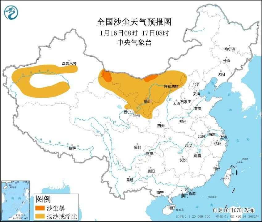 受冷空气大风影响,16日白天至18日,新疆南部、内蒙古中西部、甘肃中西部、青海东部、宁夏大部、陕西中北部、华北北部等地的部分地区有扬沙或浮尘,局地有沙尘暴。中央气象台1月16日06时继续发布沙尘天气预报。上述地区的公众需做好相关防护措施,减少外出。