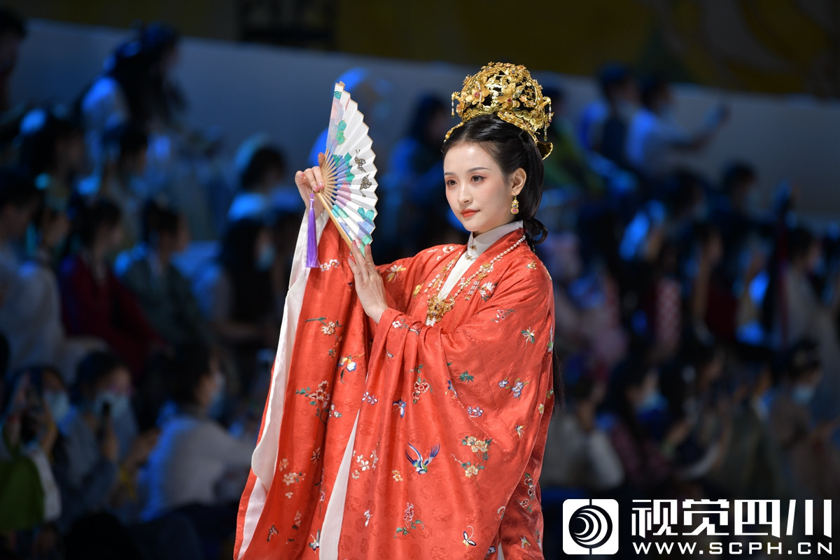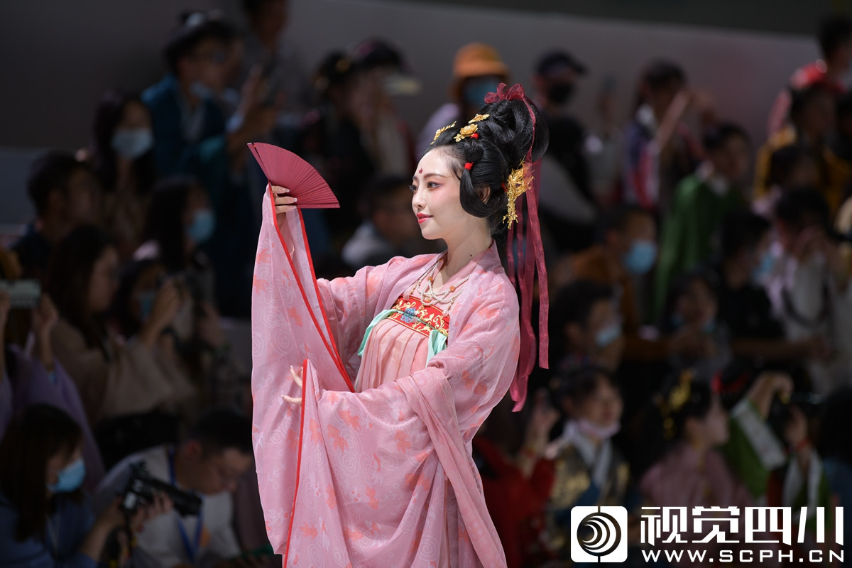 10月3日下午,一场精美绝伦的汉服走秀在中国西部国际博览城IGS博览会上拉开帷幕,上百名高颜值的汉服模特穿上各个制式、朝代的汉服,戴上精美的饰品,随着颇具古风的音乐,将一场别开生面的汉服走秀呈现在了现场观众眼前。其中有的模特展示了精心设计的走台动作,一颦一笑,顾盼生姿。在秀台两侧的观众席上,也不乏身着汉服、妆容精美的观众。