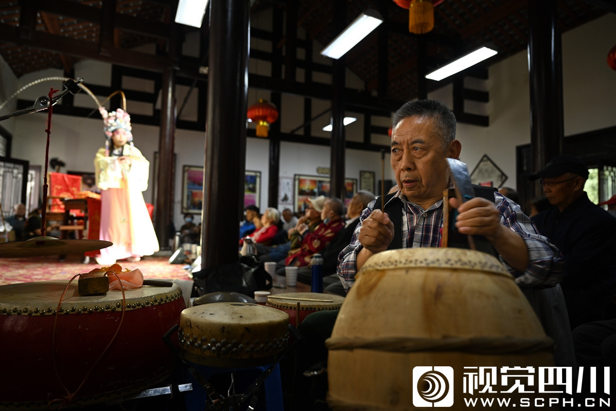 走进东顺城南街,在鼓师的紧密锣鼓地敲打下,大慈寺社区文化演艺点传出阵阵梆子声、鼓点声,虽没有帮腔的承托,飘出的二胡声和扬琴的旋律就知道这里有川剧表演。这里,常年有川剧折子戏的演出,是喜欢听戏的“戏窝子”。