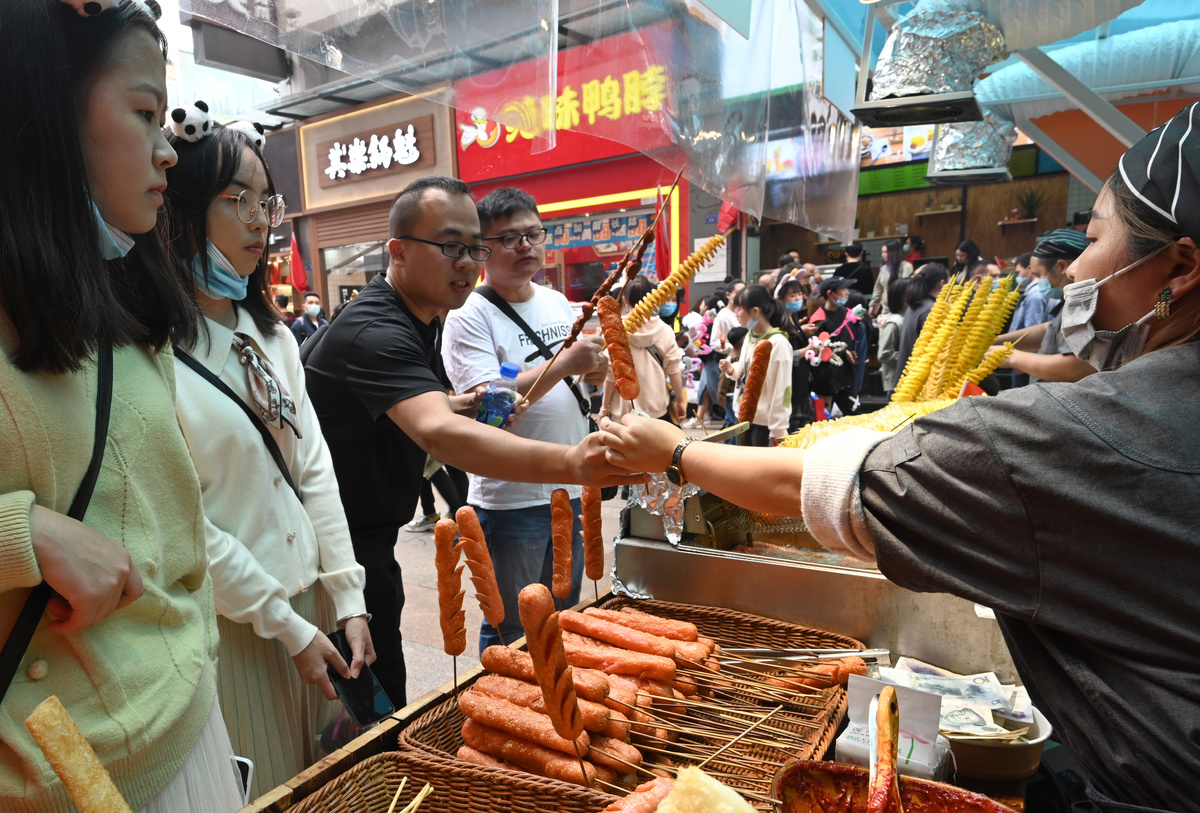 美食之都又让节日的成都街头烟火气十足。“别忙!先拍照打卡!”这是所见很多游客拿到美食的第一反应,路边吃起,美女在美食面前都放下了矜持,帅哥更是不再谦让。
