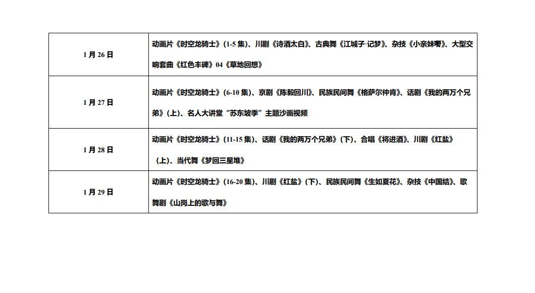 初二到初七,小朋友们可以观看动画片《时空龙骑士》,每天播放5集,每集12分钟。动画片以中国“恐龙之乡”——四川省自贡市为故事背景,讲述了恐龙骑士小分队为拯救恐龙世界守住自贡的历史,和反派势力星空展开一次次对战,最终粉碎了星空的阴谋,守护了地球家园,是小男孩会喜欢的冒险故事。