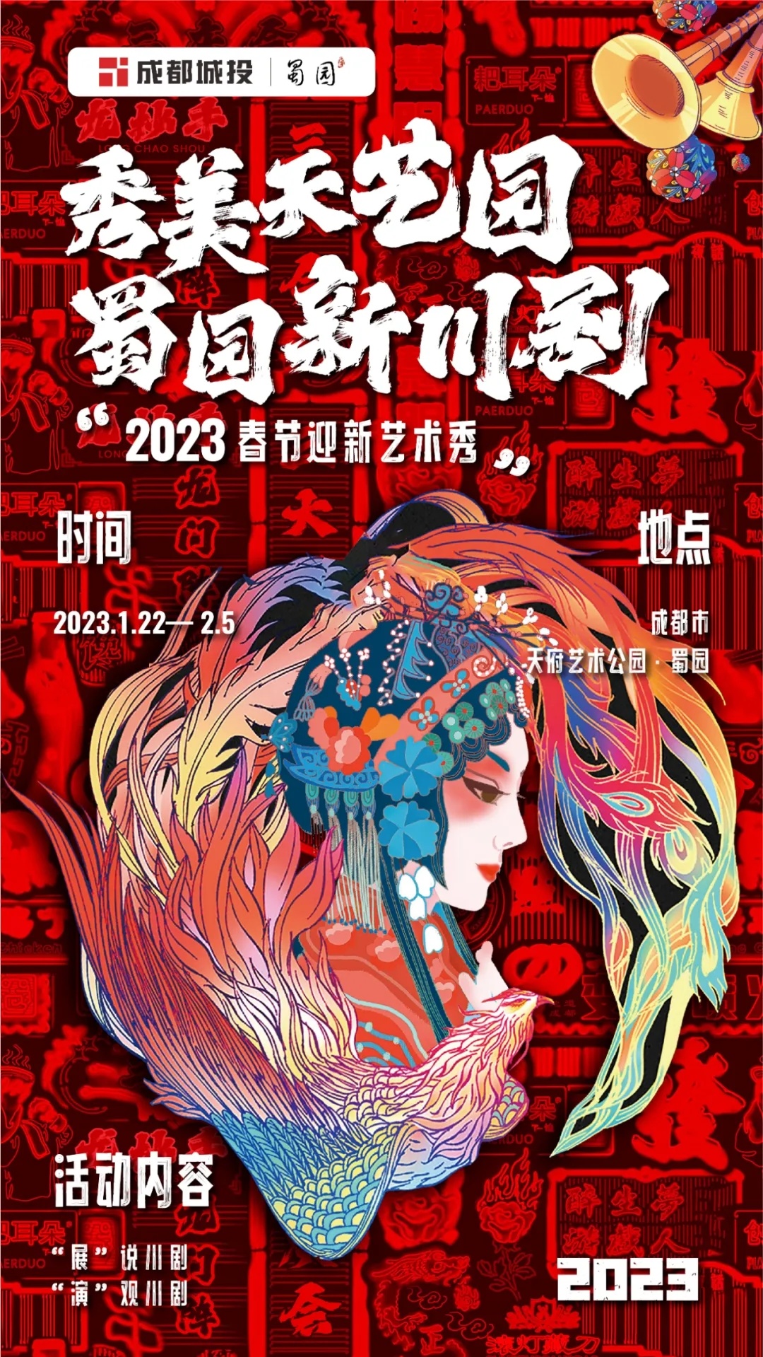 品川茶,游公园,晒着太阳把川剧看……今年春节,来过个“资格”又雅致的四川年吧!1月22日(大年初一)至2月5日(元宵节),春节迎新活动——“秀美天艺园·蜀园新川剧”2023年春节迎新艺术秀将在天府艺术公园·蜀园举办。1月19日,趁这座全国首个以川剧为主题的公园——蜀园的阳光正好,记者带你提前打探。