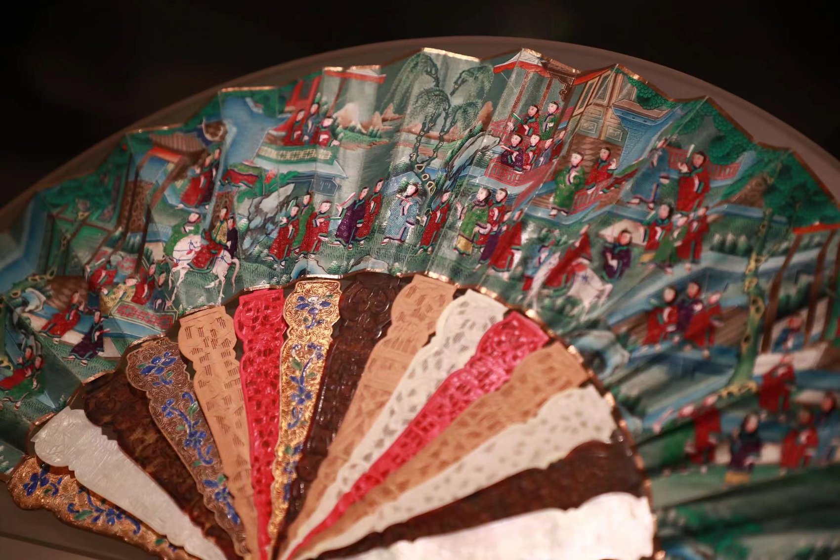 成都博物馆“广府外销扇:18-19世纪的中国风尚”展展出的庭院人物图与花鸟图五料骨纸面折扇(成都博物馆供图)