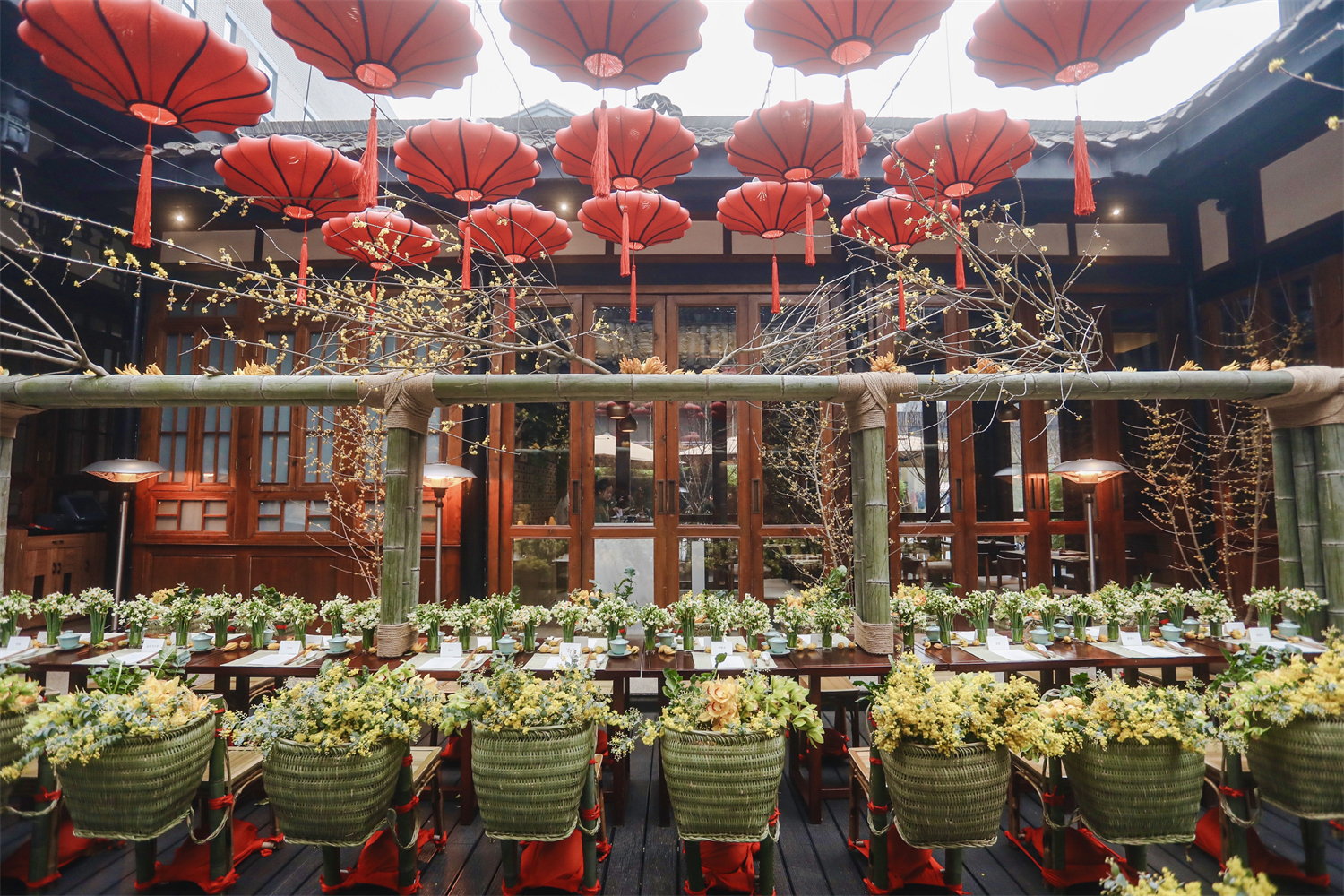 成都米其林一星餐厅博舍谧寻茶室春节期间推出“从产地,到餐桌”米其林品鉴菜肴,携手生活美学艺术家齐云打造“喜上梅梢·好彩头”艺术展——坐在生活艺术展中,品团年美味素食,让人耳目一新。