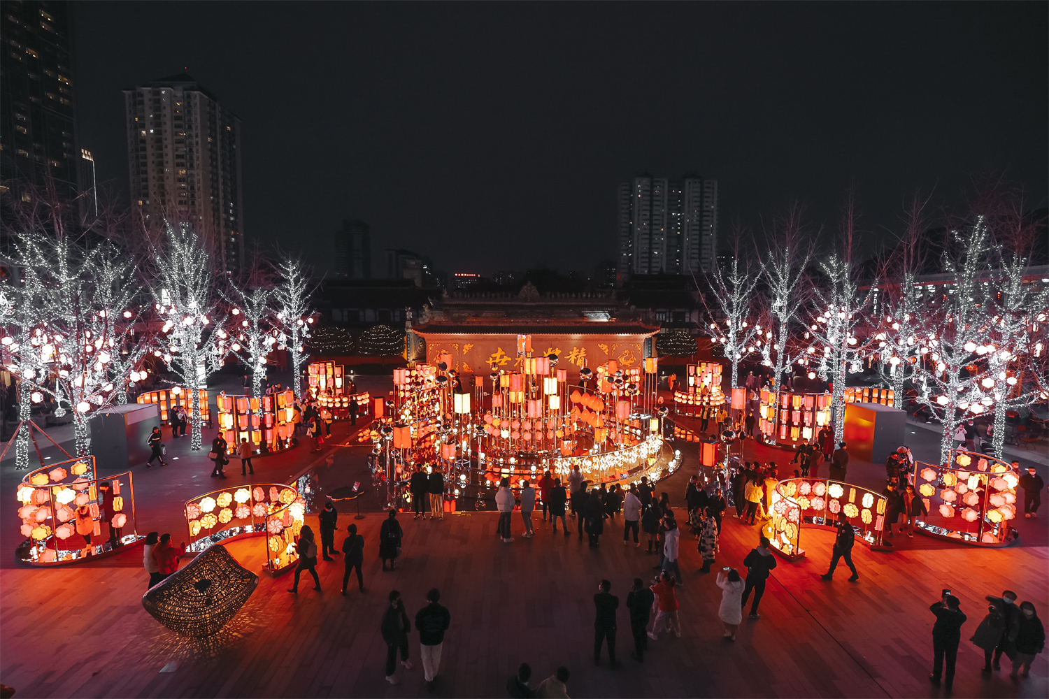 夜幕降临,成都核心商圈内,市民和外地游客在“福蓉新春”新春主题活动现场打卡。成都远洋太古里供图