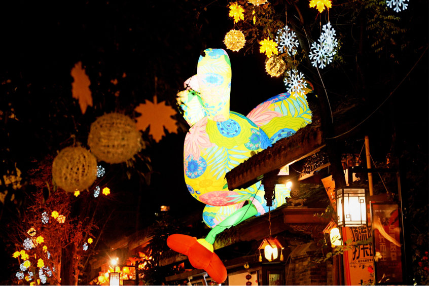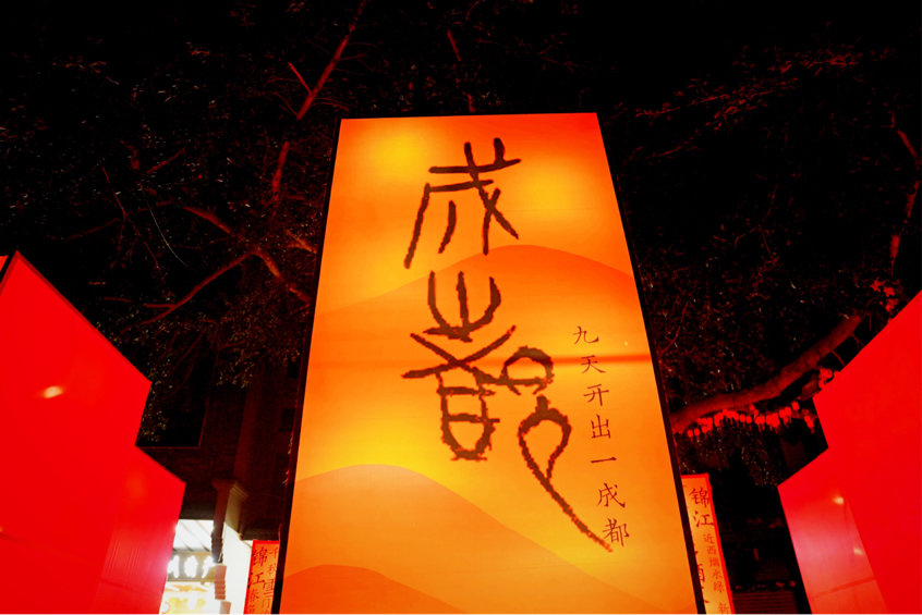 走过2023宽窄巷子光影荟,两人聊起了“成都”这一名字的由来。这是宽窄巷子首次举办的新春灯会,以诗词为线、以光影为轴,利用街区狭道、空中、屋檐、墙体等打造10大主题场景,每个场景都对应了一段诗句,承载着一段蓉城往事,打造人文会客厅新场景。主灯组“九天开出一成都”,更是将成都的诗歌文化徐徐展开,灯组正中的“成都”二字,正来源于蒲江出土的“成都矛”上的铭文,它的出现,证明成都的城市称谓早在战国晚期就已经存在。