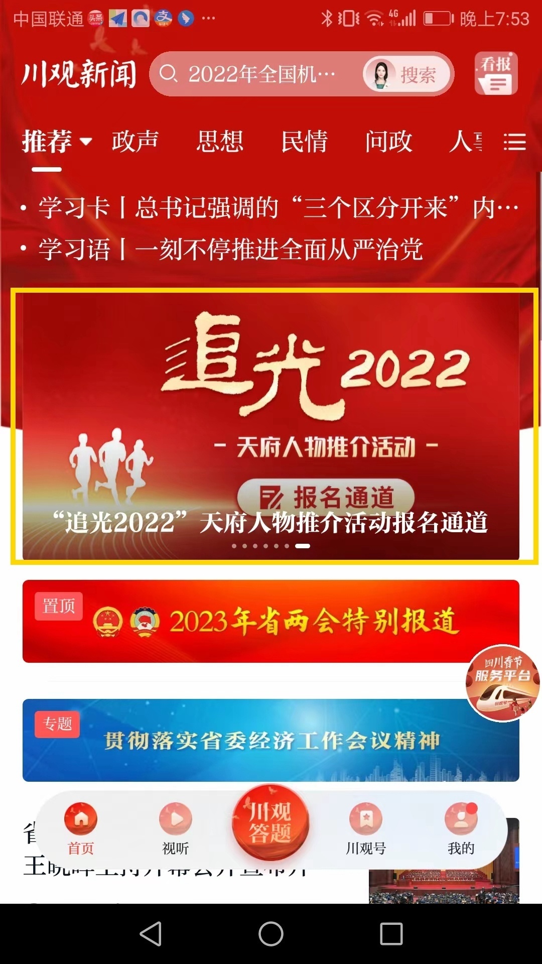 1、登录川观新闻客户端,点击上方“追光2022”天府人物推介活动报名通道,或点击右侧悬浮球进入报名通道。
