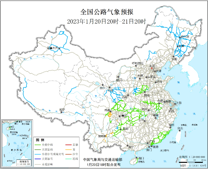 根据中国气象局与交通运输部1月20日联合发布的全国主要公路气象预报: