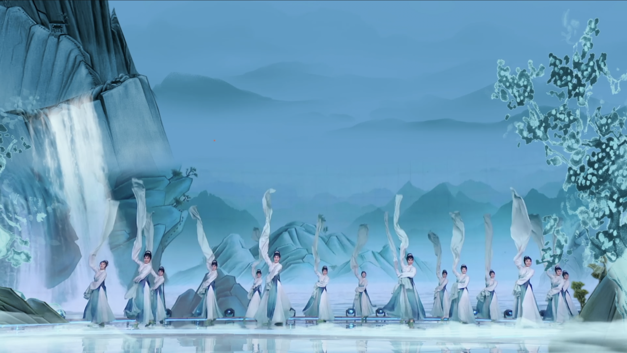 “江水为青衣,青衣犹江水”,2023川渝春晚舞蹈《一江清水》通过对川渝自然形态的捕捉,透过戏曲青衣中“水袖”甩动呈现出江水荡漾的感觉。16位婉约婀娜的青衣女子,在山川流水间水袖长舞,时而婉转、时而灵动,如梦似幻、意境悠长。水墨画的背景与一袭青衣的姑娘们融为一体,描绘出川渝山水秀丽诗意的绝美画卷,为观众呈现了“每一帧都是画”的视觉盛宴。