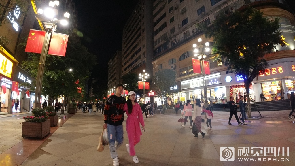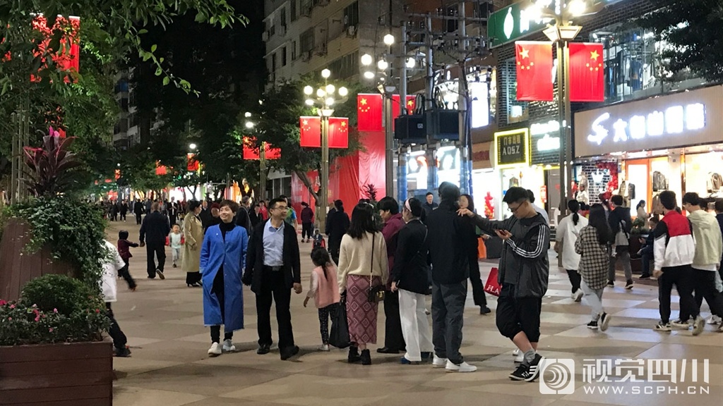 10月5日晚,达州市通川区大北街上人来人往,道路两侧悬挂着鲜艳的五星红旗,节日气氛浓厚。