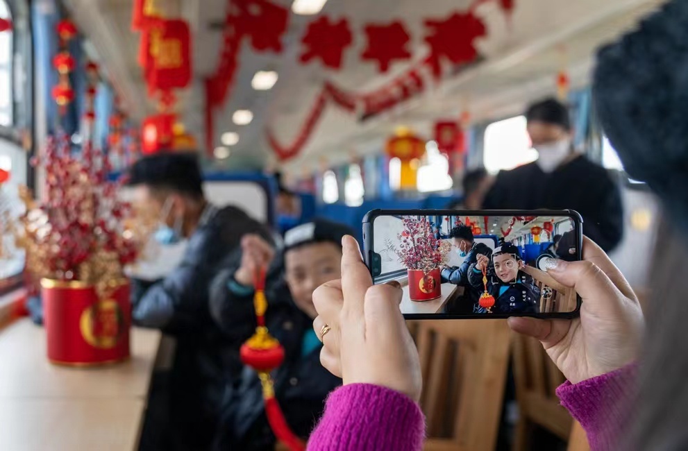 临近年关,慢火车上年味儿十足。车窗上贴着红艳艳的窗花,车厢两侧高挂着红灯笼,就连座位套也装饰上了喜庆的蝴蝶结。