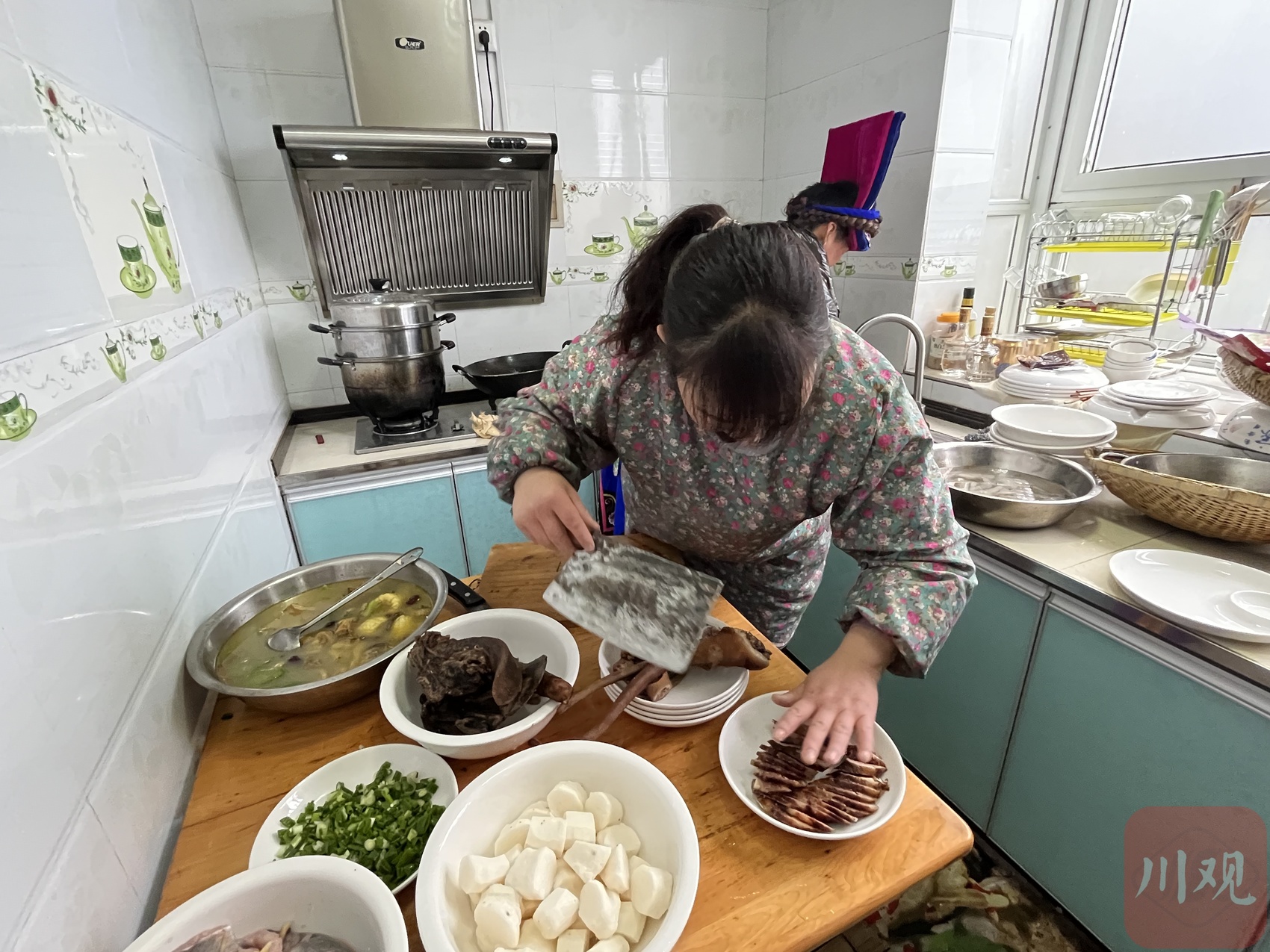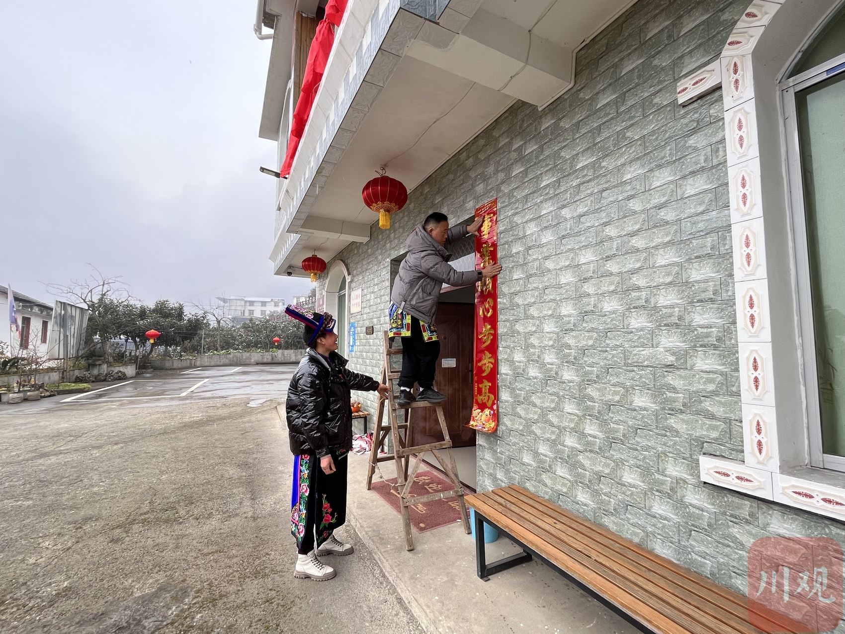 相比往年,这个春节她家的厨房更忙碌,为了准备这场团年饭,黄彦和嫂子提前几天就开始备菜。屋外黄彦的老公陈继良也忙个不停,将羌红绑在屋外,贴起了春联。“这是我们羌族的习俗,代表着吉祥如意。每年春节,我们都以此寄托自己对于新的一年的希冀。”陈继良说。