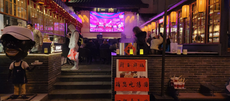 疫情防控政策优化调整后,他和家人就计划来成都过年。1月21日下午刚在酒店安顿好,陈钊就逛到了附近的宽窄巷子,得知壹丁咖啡馆晚上会直播春晚,还免费赠送汤圆,就出来和大家一起感受春节气氛。