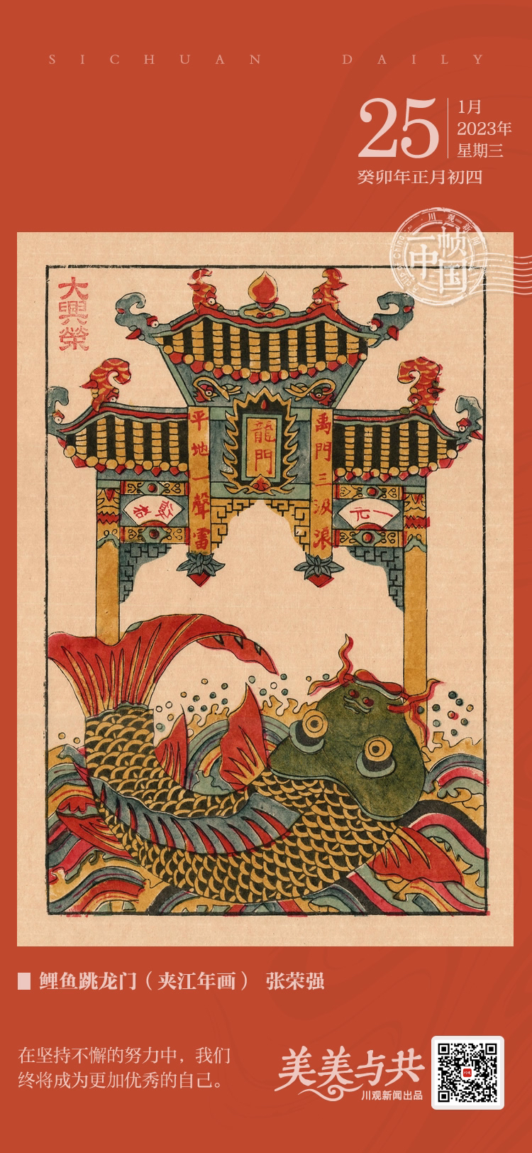 《鲤鱼跳龙门》由夹江年画省级代表性传承人张荣强根据一件早年夹江年画作品依样雕刻完成。作品为套色木刻,张荣强共制作了五块木版,分六次叠加完成。整件作品以黄、红为主,少了传统年画的艳丽,多了几分雅致。