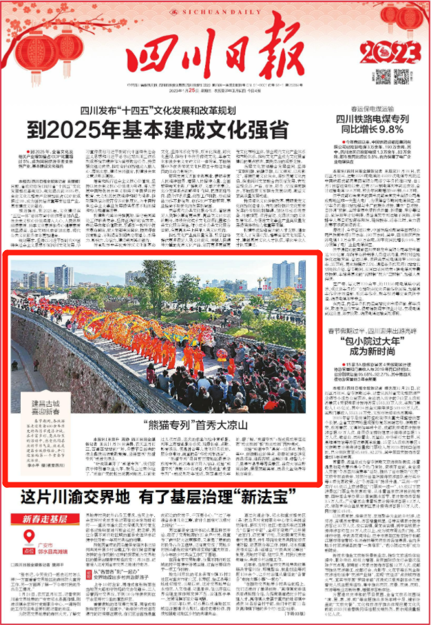 1月25日,四川日报在一版看点位置聚焦凉山州西昌市,刊发《建昌古城喜迎新春》大幅图文和《 “熊猫专列”首秀大凉山》稿件,展现农历春节期间,在丰富多彩、亮点纷呈的活动中,游客在西昌市建昌古城感受热闹喜庆的节日气氛。以及大量游客乘坐“熊猫专列”到西昌旅游的场景。