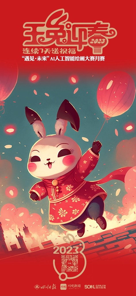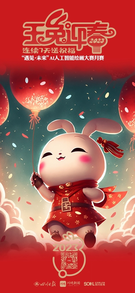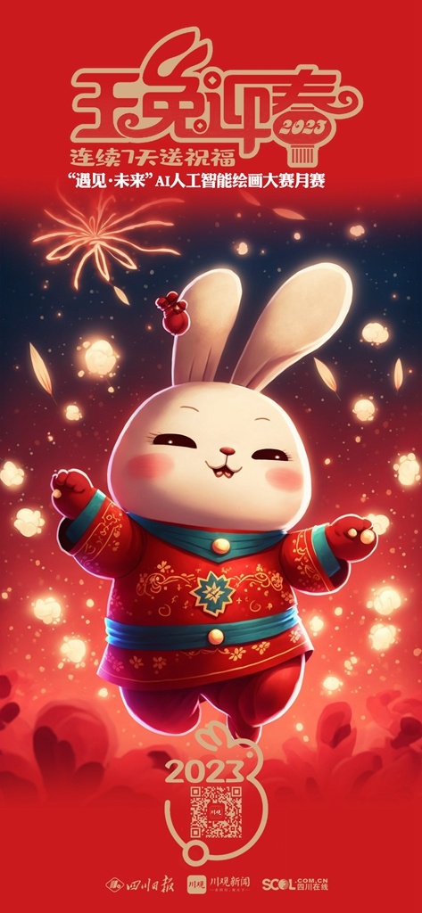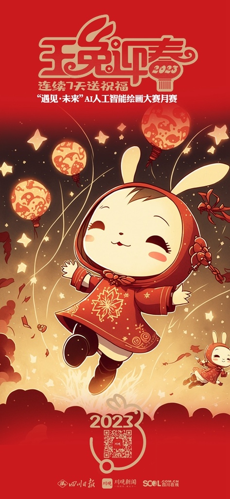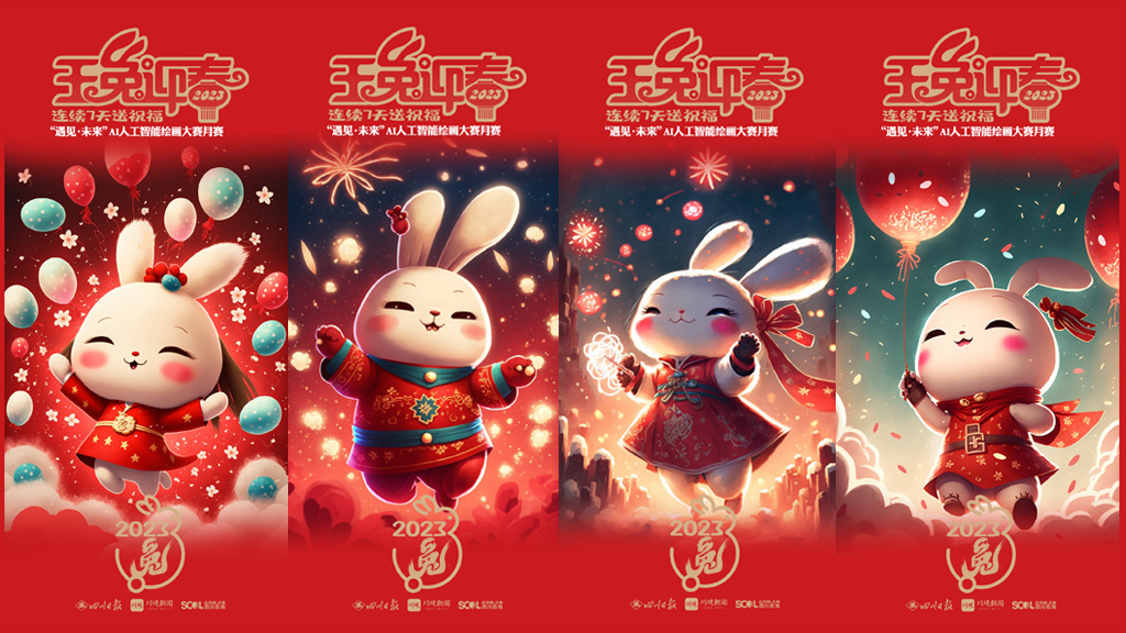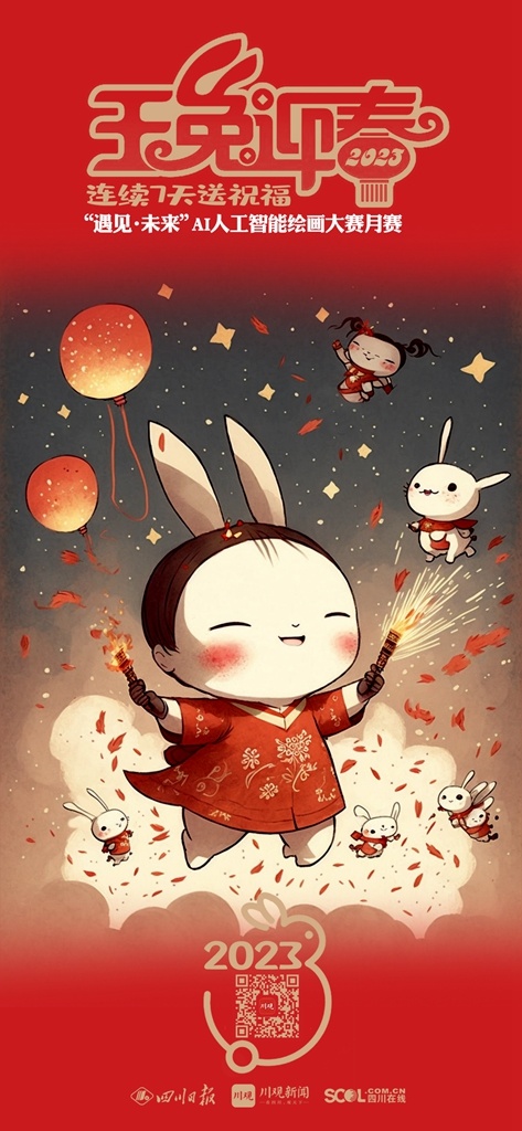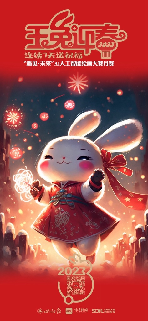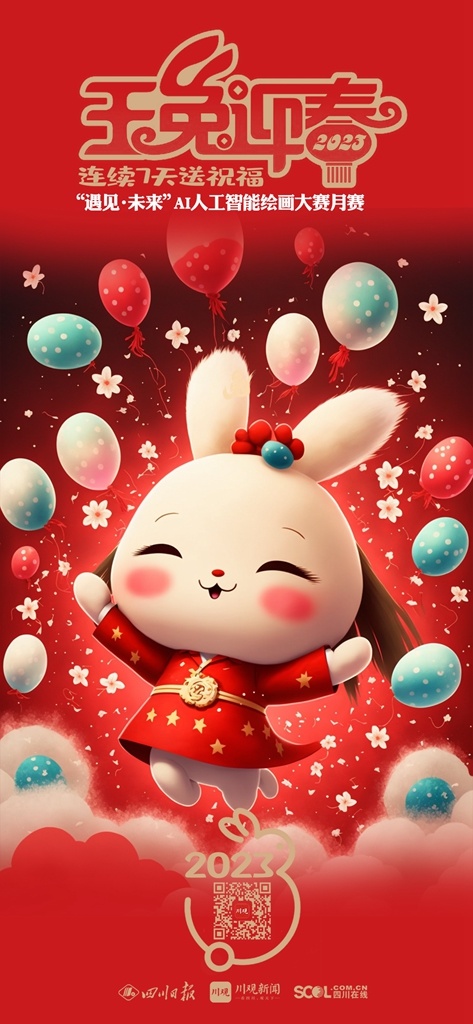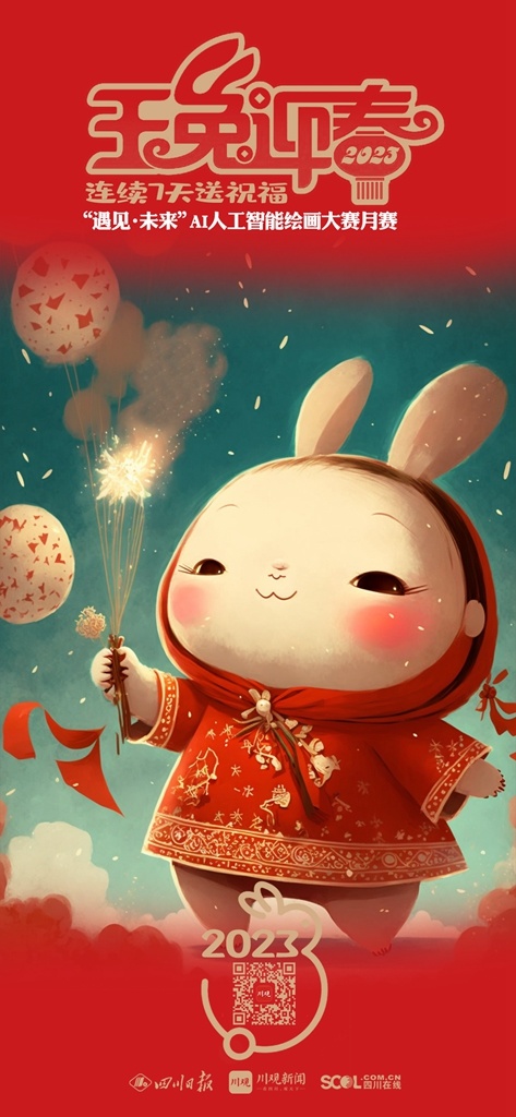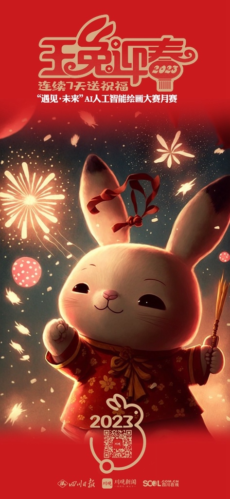 2023年新春佳节,参与 “遇见·未来”AI人工智能绘画大赛月赛的艺术家们将在1月21日(除夕)——1月27日(初六)连续7天,通过川观新闻客户端送出用AI画笔绘制的“瑞兔迎春”贺卡,祝福全球网友2023年大展宏“兔”,前“兔”似锦。