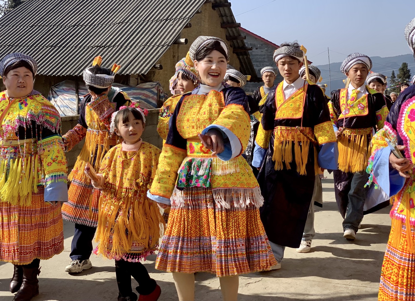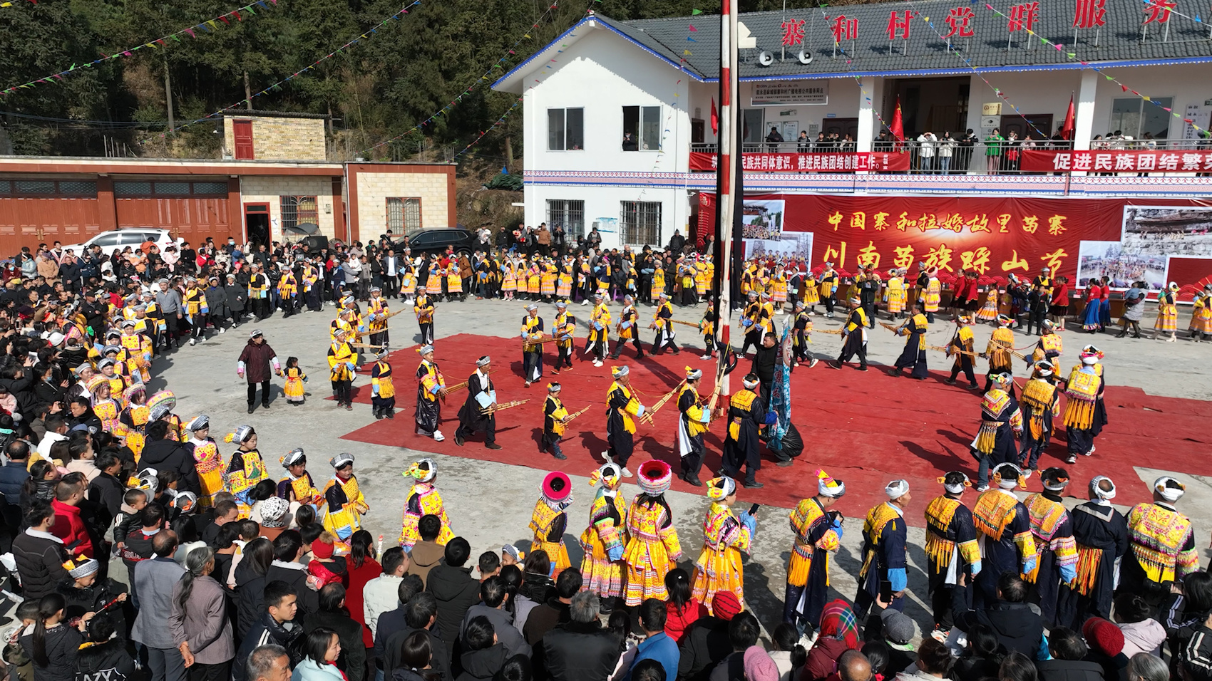 1月29日,一根用杉木做成的约15米的花杆,笔直的立在叙永县麻城镇寨和村花山院坝中央,24根被连成串的小彩旗从杆头呈放射状与地面相连。麻城镇的苗族同胞身着民族服装围着花杆吹芦笙,载歌载舞,热闹非凡。