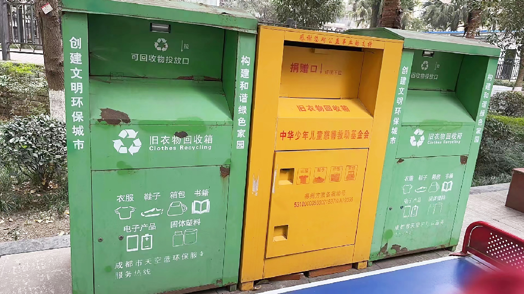 成都一小区内,慈善旧衣回收箱与回收公司回收箱摆放在一起。