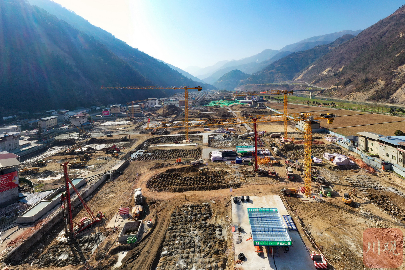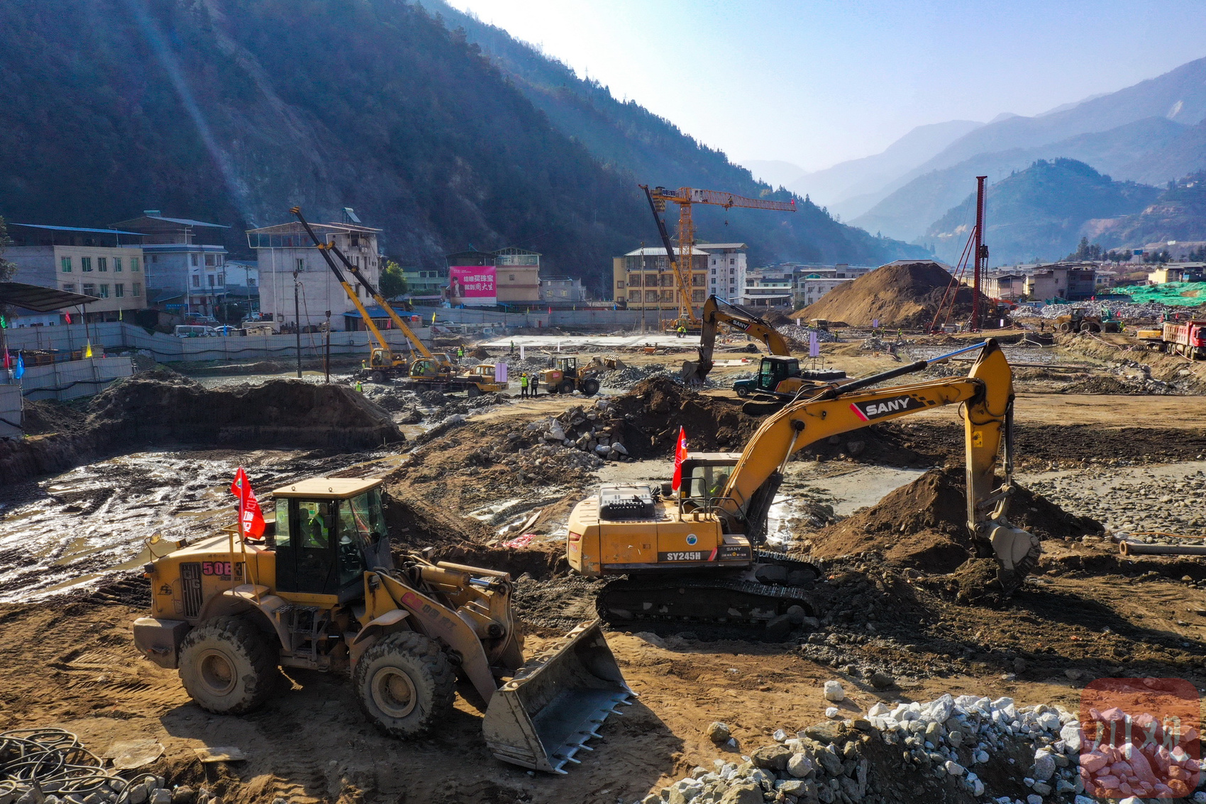 1月30日早上,走进石棉县王岗坪挖角集镇片区灾后恢复重建项目,冬日暖阳刚刚升上山头,火红的新春灯笼仍悬挂在大门口。塔吊林立的建设工地上,挖掘机、装载机来回作业,四处机械轰鸣,建设火热。