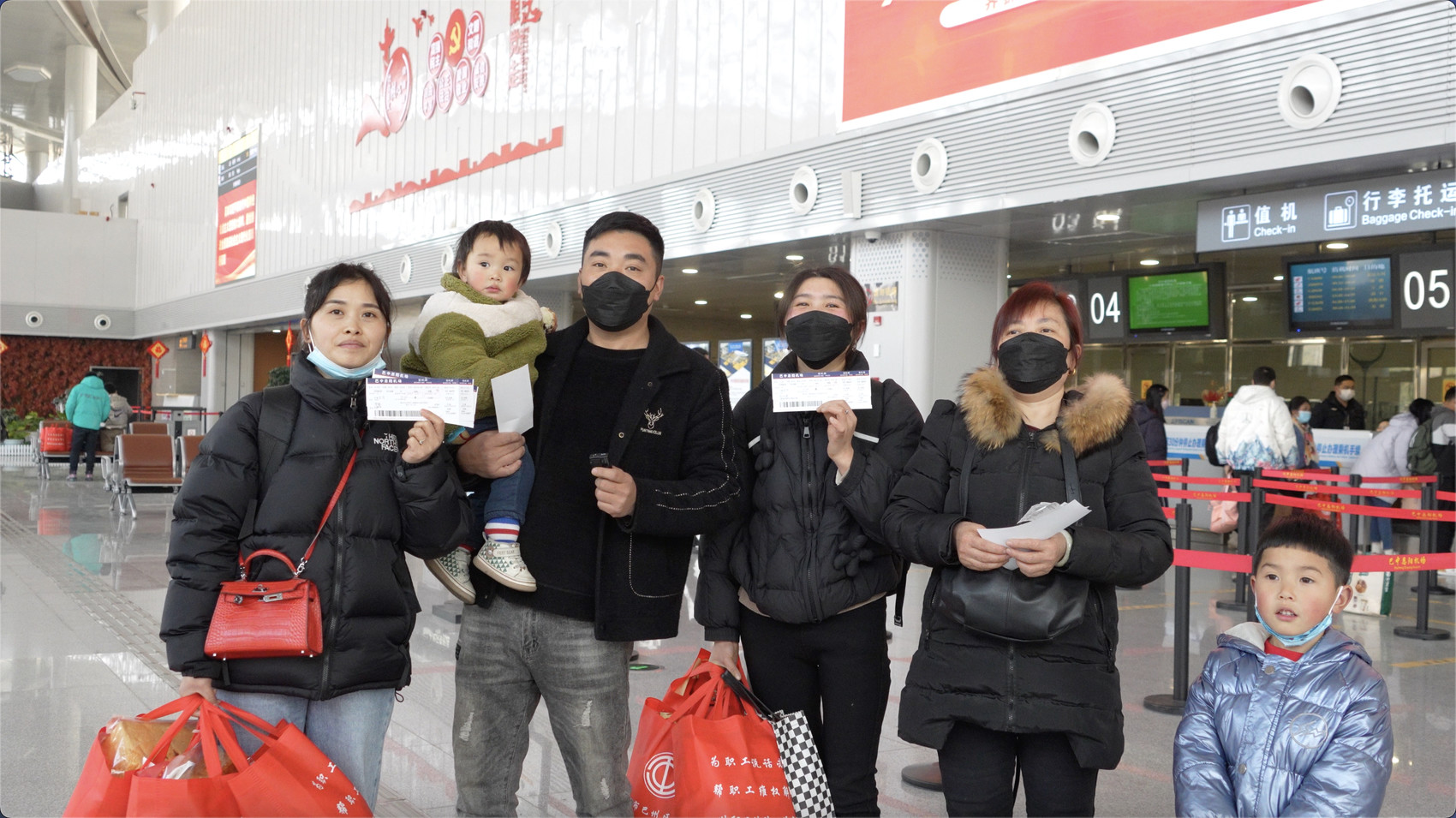 1月31日,在恩阳机场候机厅,外出前往浙江省义乌市的巴中籍农民工正准备检票出发。
