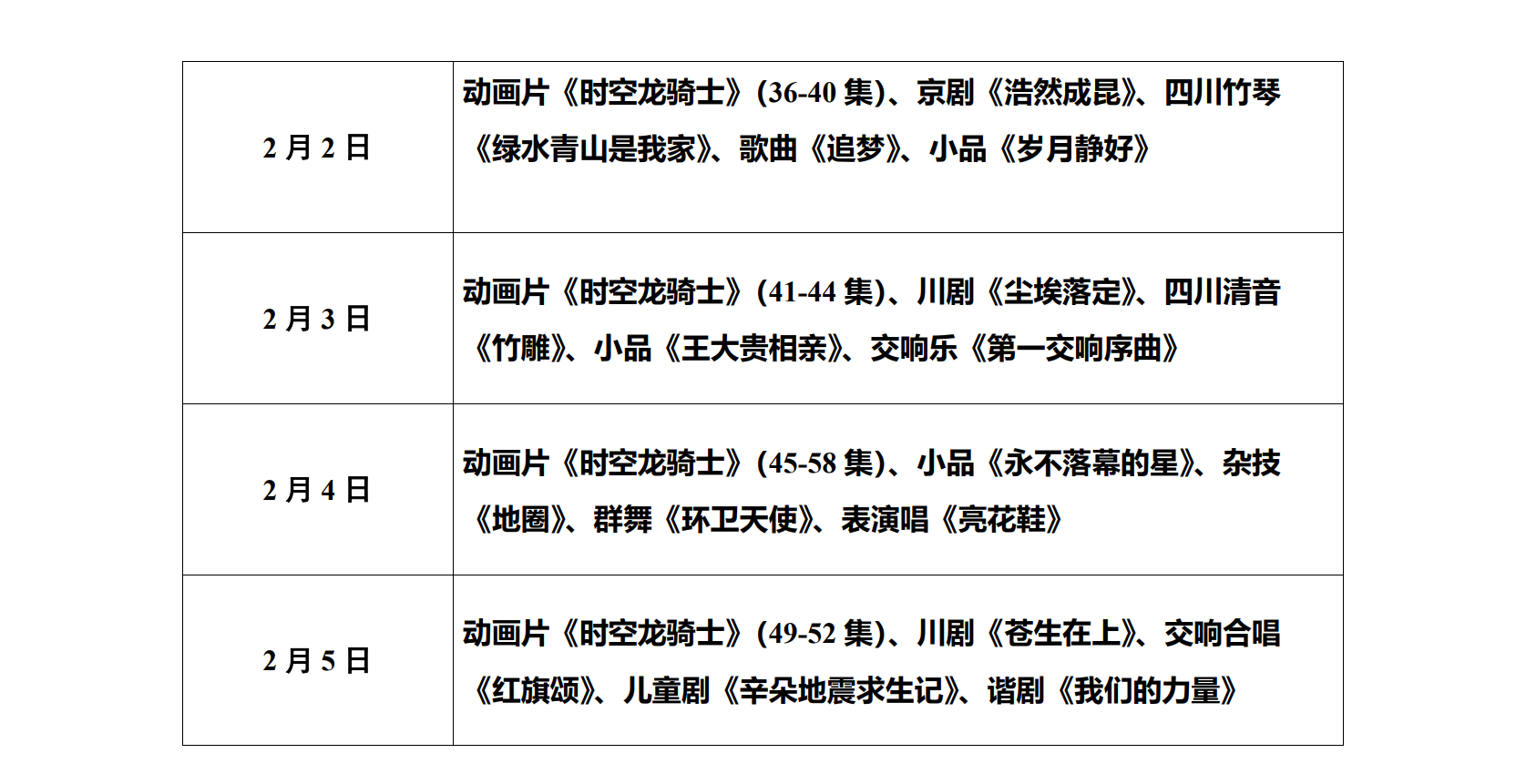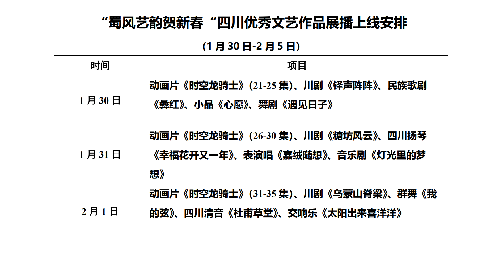 1月30日至2月5日,网络展播将持续播出动画片《时空龙骑士》(21—52集)、川剧《铎声阵阵》、民族歌剧《彝红》、小品《心愿》、舞剧《遇见日子》、川剧《糖坊风云》、四川扬琴《幸福花开又一年》、表演唱《嘉绒随想》、音乐剧《灯光里的梦想》、川剧《乌蒙山脊梁》、群舞《我的弦》、四川清音《杜甫草堂》、交响乐《太阳出来喜洋洋》等近40个节目。