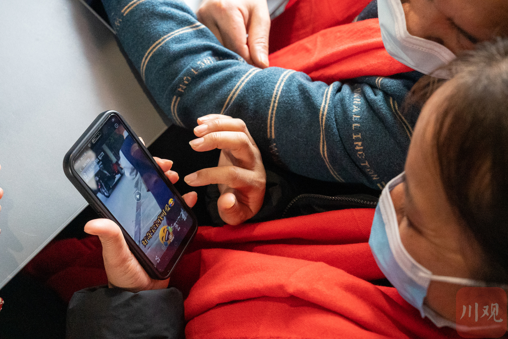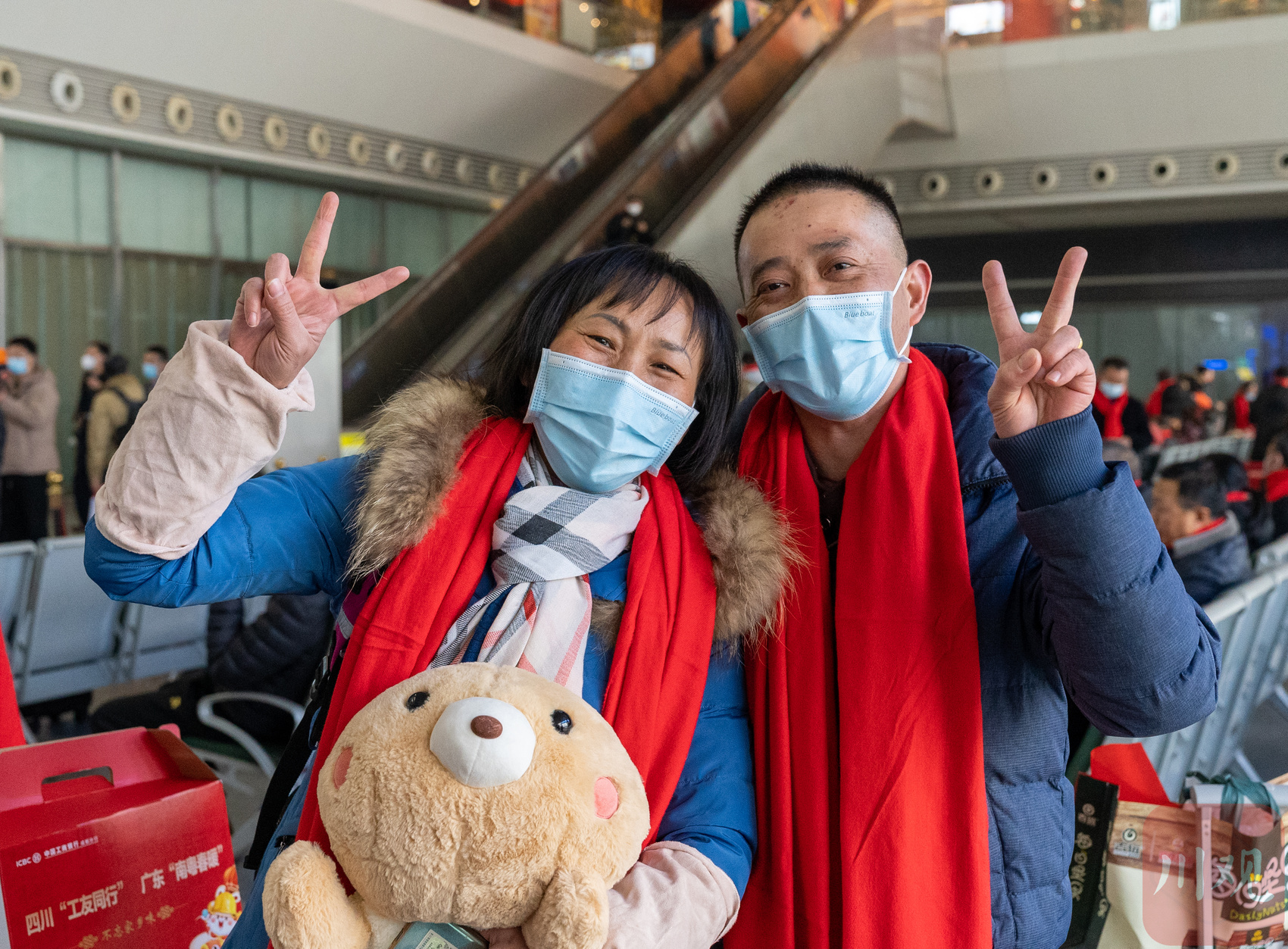 成都东站候车大厅,杨云坤和王海燕夫妻在等待专列发车。