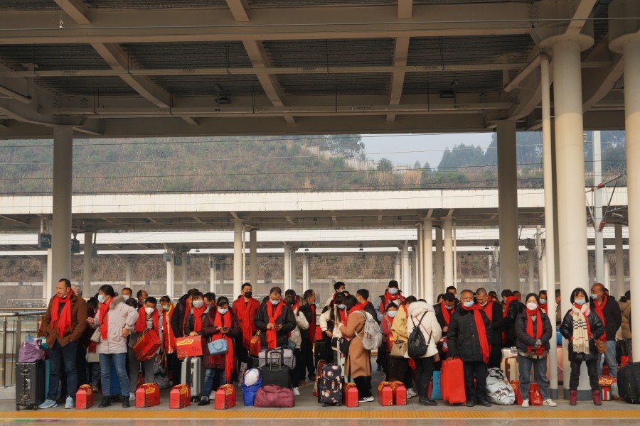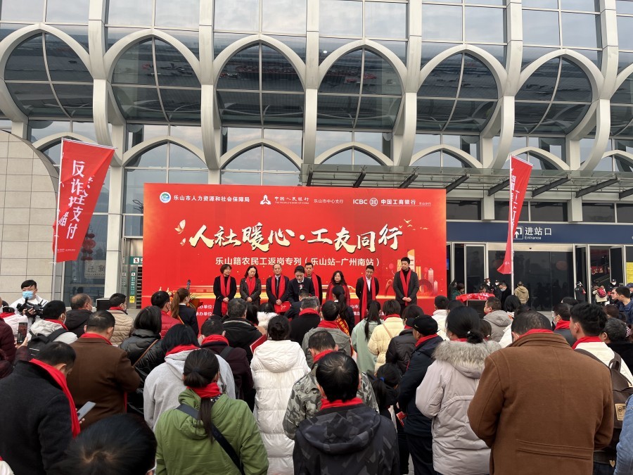 据了解,这是乐山市今年以来的首趟为乐山籍农民工组织“乐山站-广州南站”春节后返岗复工专列。临行前,乐山市人社局还举办了“人社暖心 工友同行”乐山籍农民工赴粤返岗专列活动,现场为百名乐山籍农民工派发了“爱心大礼包”,里面含有米花糖、沙琪玛、大头菜、口罩等物品,希望给外出的他们提供家乡的温暖。