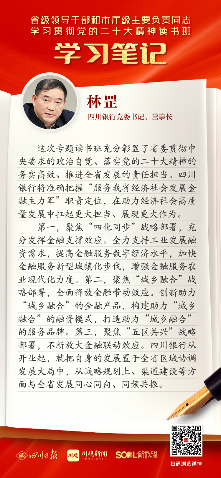 这次专题读书班充分彰显了省委贯彻中央要求的政治自觉、落实党的二十大精神的务实高效、推进全省发展的责任担当。四川银行将准确把握“服务我省经济社会发展金融主力军”职责定位,在助力经济社会高质量发展中扛起更大担当、展现更大作为。