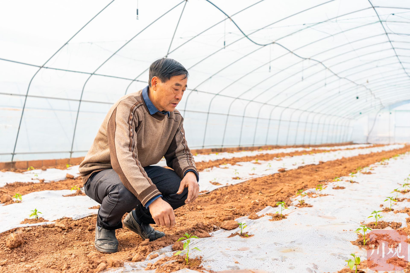 大棚负责人正在查看育苗情况