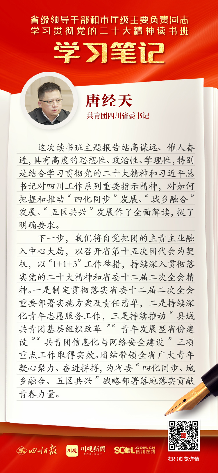 这次读书班主题报告站高谋远、催人奋进,具有高度的思想性、政治性、学理性,特别是结合学习贯彻党的二十大精神和习近平总书记对四川工作系列重要指示精神,对如何把握和推动“四化同步”发展、“城乡融合”发展、“五区共兴”发展作了全面解读,提了明确要求。