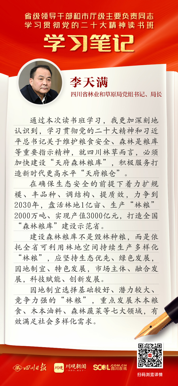 通过本次读书班学习,我更加深刻地认识到,学习贯彻党的二十大精神和习近平总书记关于维护粮食安全、森林是粮库等重要指示精神,就四川林草而言,必须加快建设“天府森林粮库”,积极服务打造新时代更高水平“天府粮仓”。