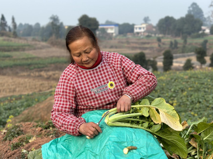 “我种了十几年青菜(芥菜)了,有三亩多地,今年一亩能产6000斤(干菜)。”宗场镇赤岩村村民何福君大哥走下田间,开始收割制作芽菜的原料芥菜。他挥舞着手中的弯刀边干边介绍,芥菜的种子是往年留下的。芥菜管养“不费事”,亩成本在300元-500元左右,产值约3000元/亩。