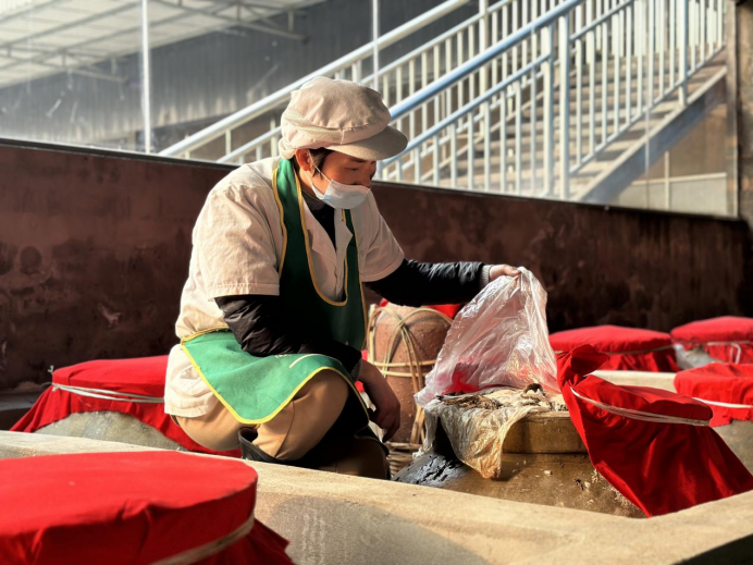 工作人员查看腌制罐密封情况。