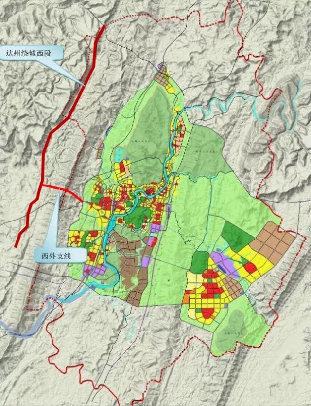 达州绕城高速西段主线起于通川区安云乡,接G5012恩广高速公路,经达川区大堰镇、原金檀乡(现管村镇),止于达川区罐子镇,接营达高速公路。城市组团西外支线起于主线达川区大堰镇附近,设隧道穿越铁山后接城市道路金南大道西延线。