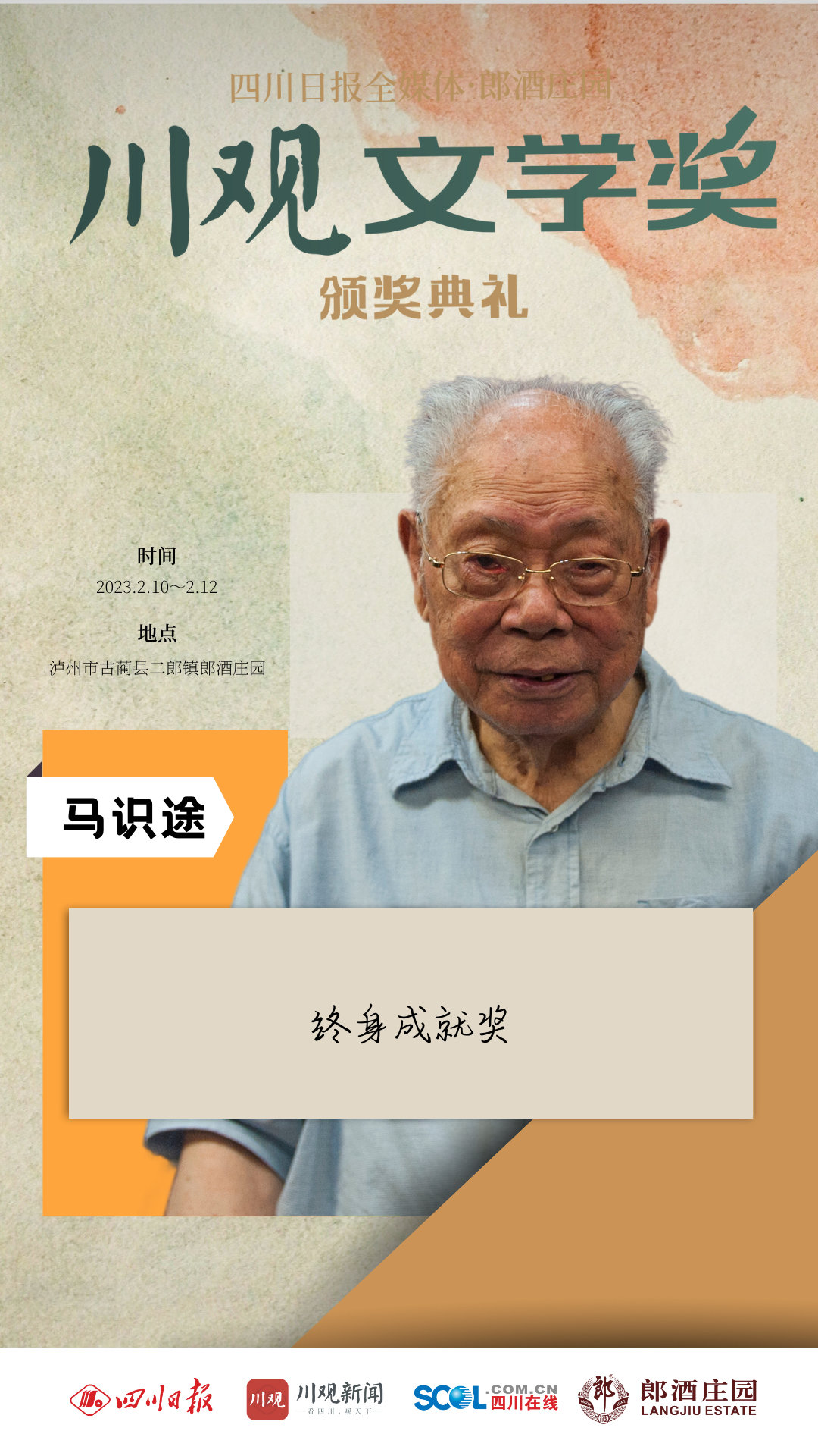 川观文学奖终身成就奖授奖词写道:“作为一个著作等身的大作家,马识途少出夔门,志怀报国;百岁不老,笔耕不辍。几十年来写下了700余万字的各类体裁的文学作品,其中多反映中国革命斗争的历史,是中国革命文学、中国现当代文学史上一笔丰厚的宝贵财富。戎马与笔墨,革命和文学,在他的身上完美融为一身,他以革命的行动再造家邦,以文学的妙笔书写时代。”