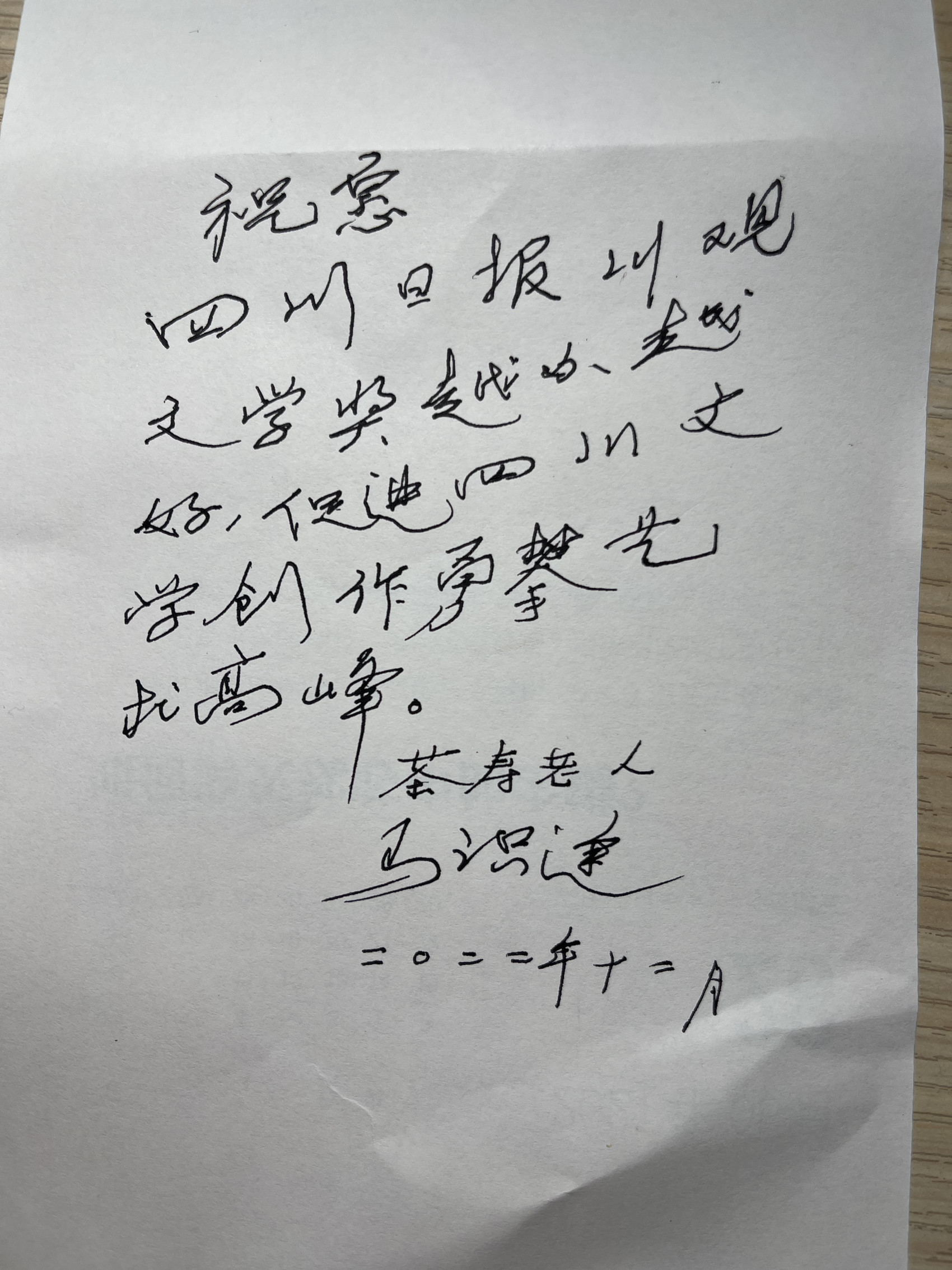 尽管未能亲临颁奖典礼现场,马识途仍早早为此次获奖亲笔书写了答谢词,并深情寄语川观文学奖:“祝愿四川日报川观文学奖越办越好,促进四川文学创作勇攀艺术高峰。”