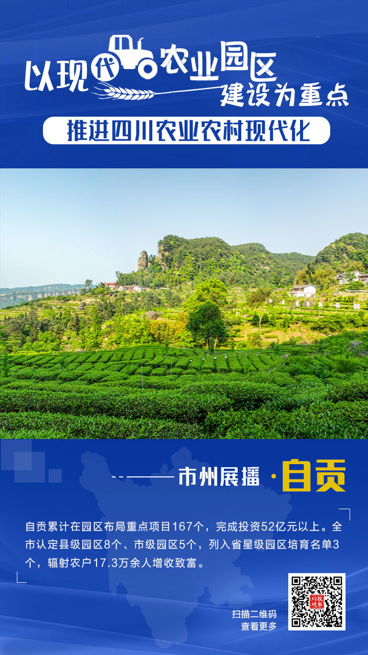 2016年起,自贡按照“一区六园”现代农业园区的部署,,市级打造150平方公里自贡市现代农业产业园区,即“一区”,各区县建设规模10万亩以上现代农业产业示范园,即“六园”。截至目前,全市已开工建设现代农业园区23个。去年认定县级园区8个。去年,全市打造5000亩以上产业连片核心区16个,实现产值49.6亿元,带动农户17.3万余人。