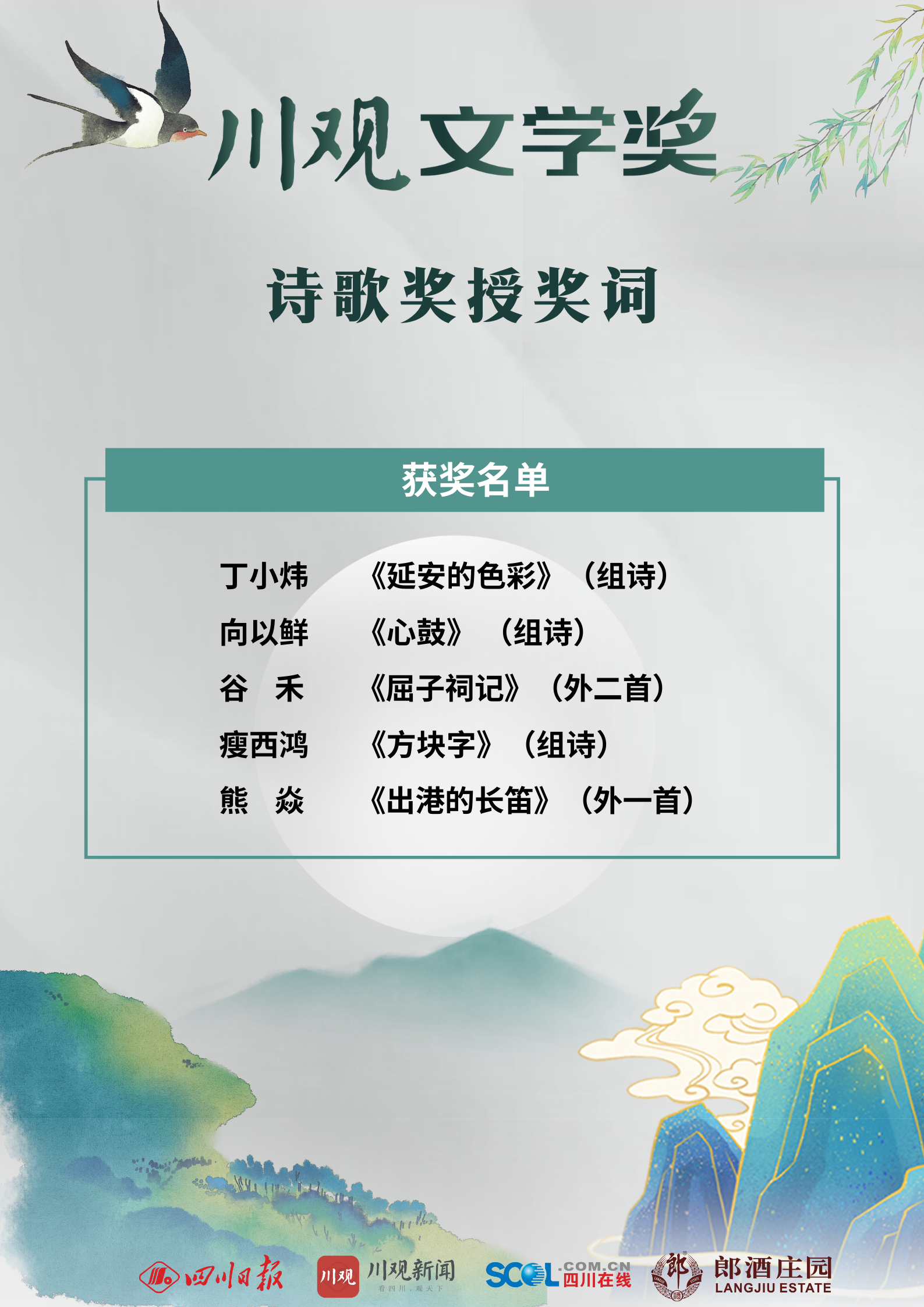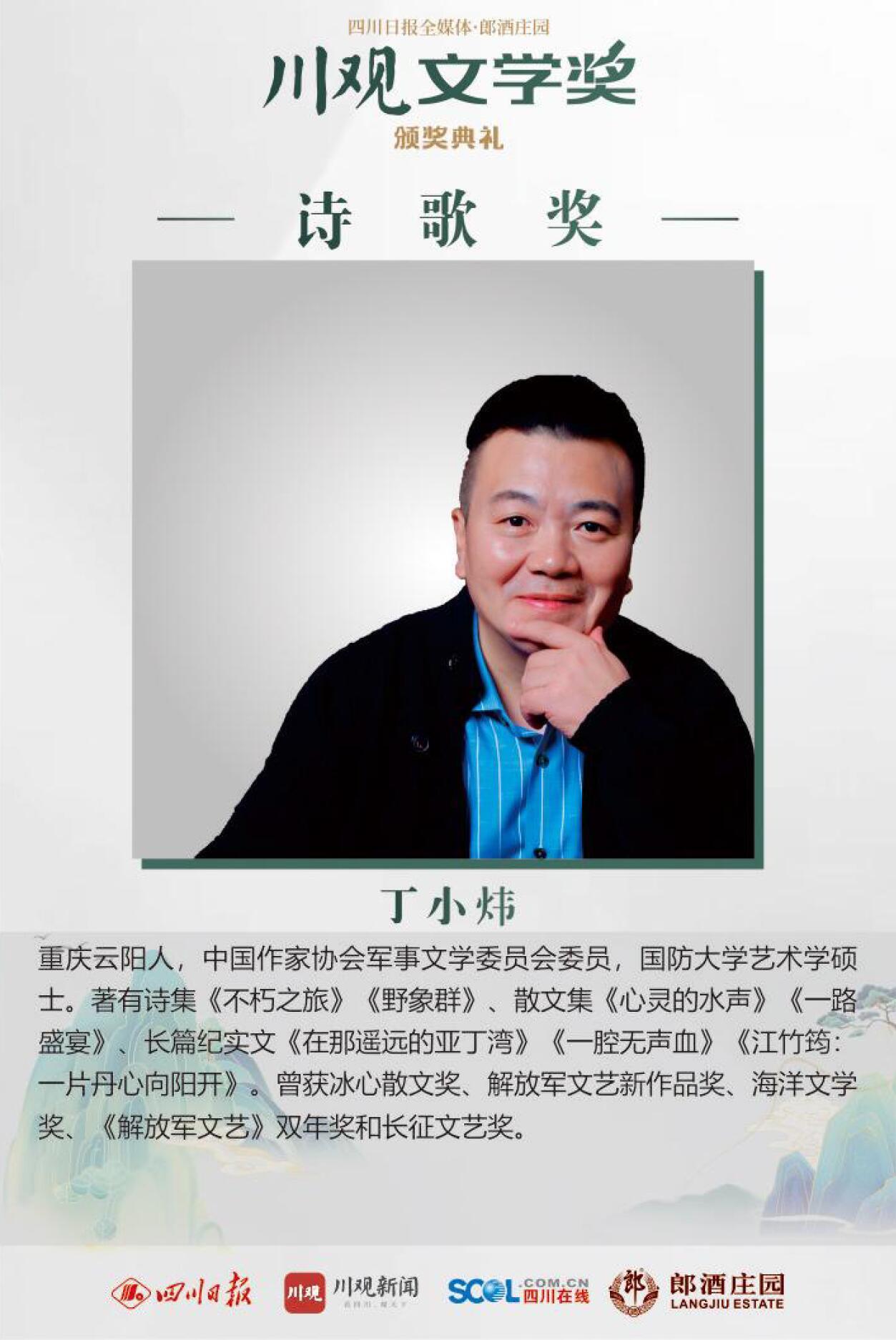 红、白、灰、蓝、黑、绿、金,这是丁小炜眼中延安的色彩,也是建党百年伟大征程中光荣与梦想的色彩。丁小炜敏锐把握时代的脉息,透过延河、宝塔山、南泥湾等典型的延安意象,思往事、看今朝,历史与现实交相呼应、写实与写意双线并行,让我们看到了艰苦朴素的百年来路,让我们听到了激情高昂的奋斗华章。有鉴于此,授予丁小炜《延安的色彩》(组诗)川观文学奖(2021年度)诗歌奖。