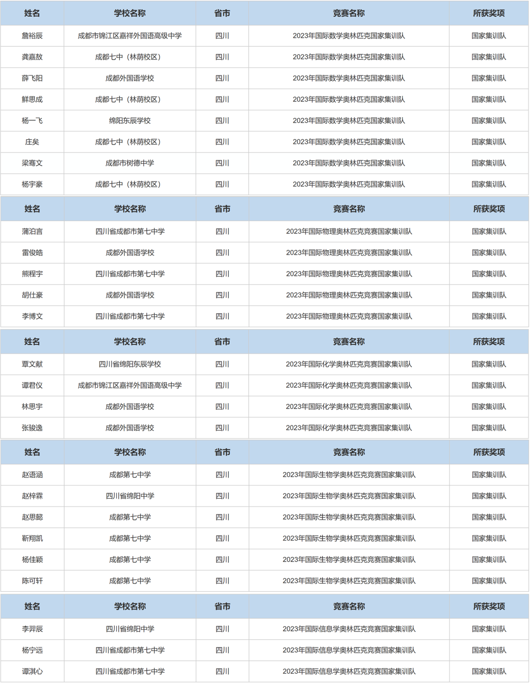 五项学科竞赛国家集训队 四川详细名单列表