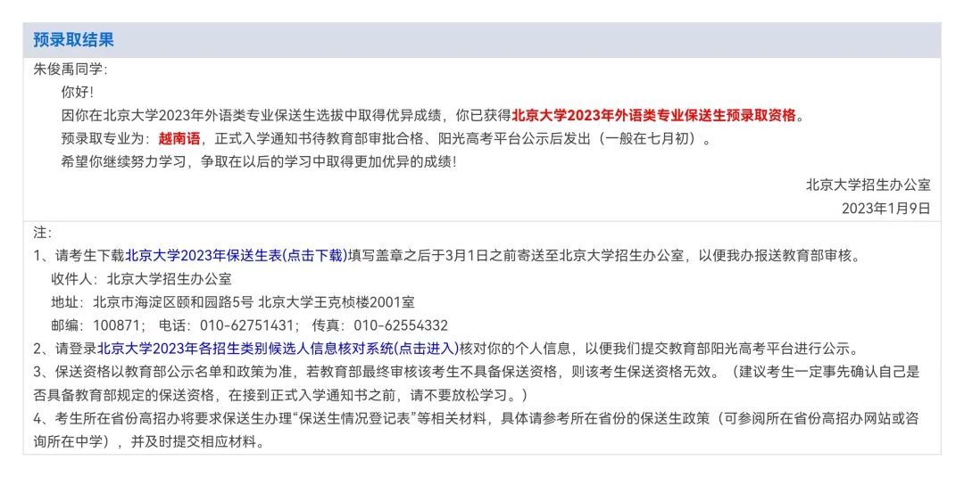 北京大学预录取结果通知 图源受访者