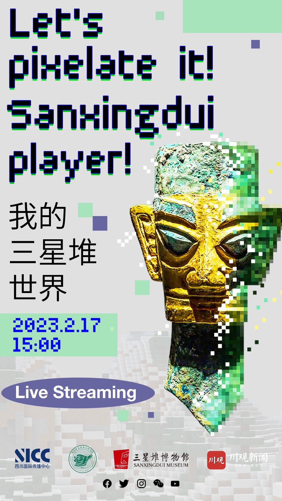 2.你也可以在Facebook、Twitter、instagram、YouTube平台发布作品,并带上 #PixelateSanxingdui 标签