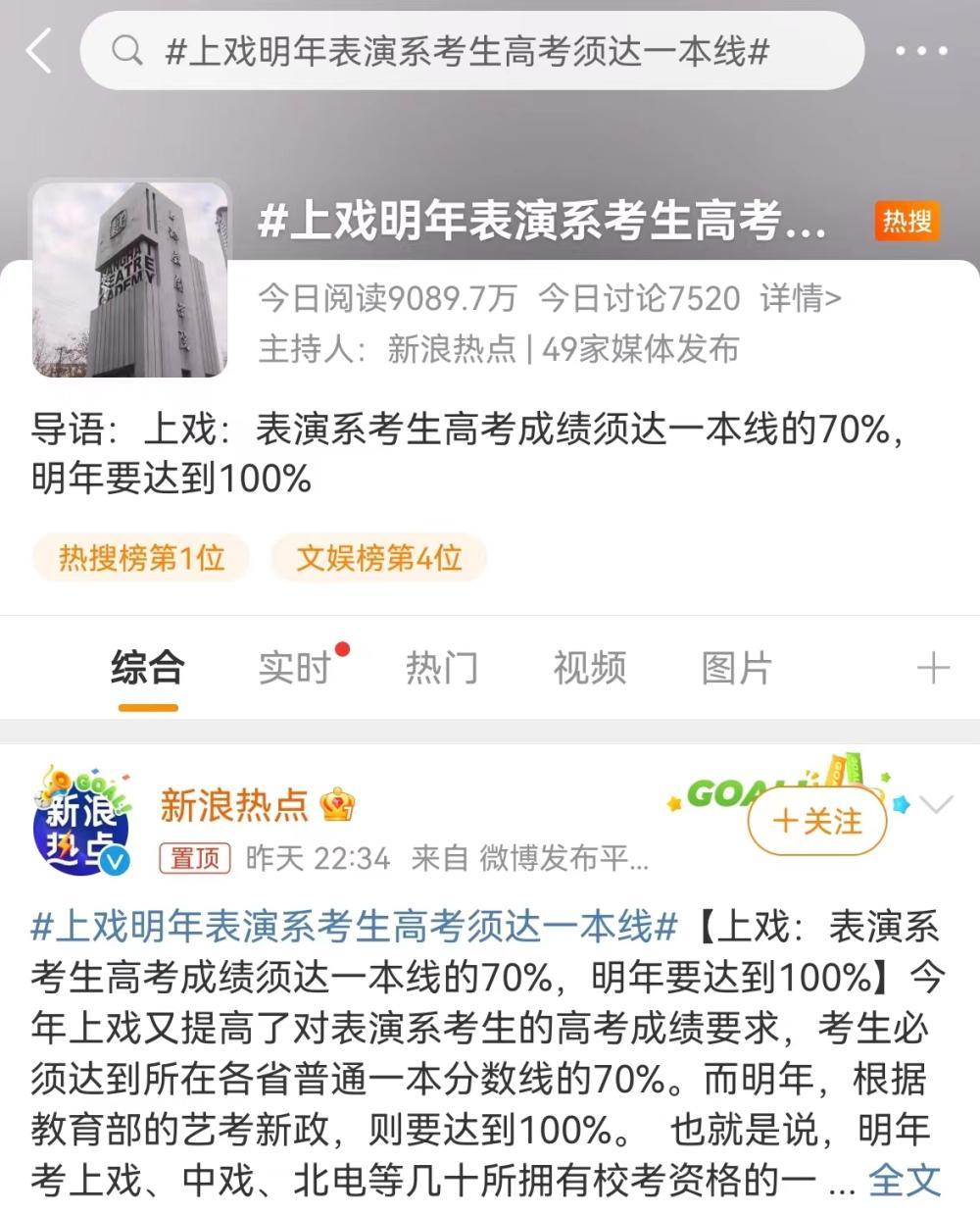 2月18日,有媒体报道,上海戏剧学院2024年招生需要达到一本线。19日一早,“上戏明年表演系考生高考须达一本线”冲上微博热搜第一。对此,记者从上海戏剧学院获悉,“上戏明年表演系考生高考须达一本线”系误读,明年上海戏剧学院招生继续遵循教育部相关要求,表演等校考专业招生分数线不低于普通本科录取控制分数线,而非“一本线”。