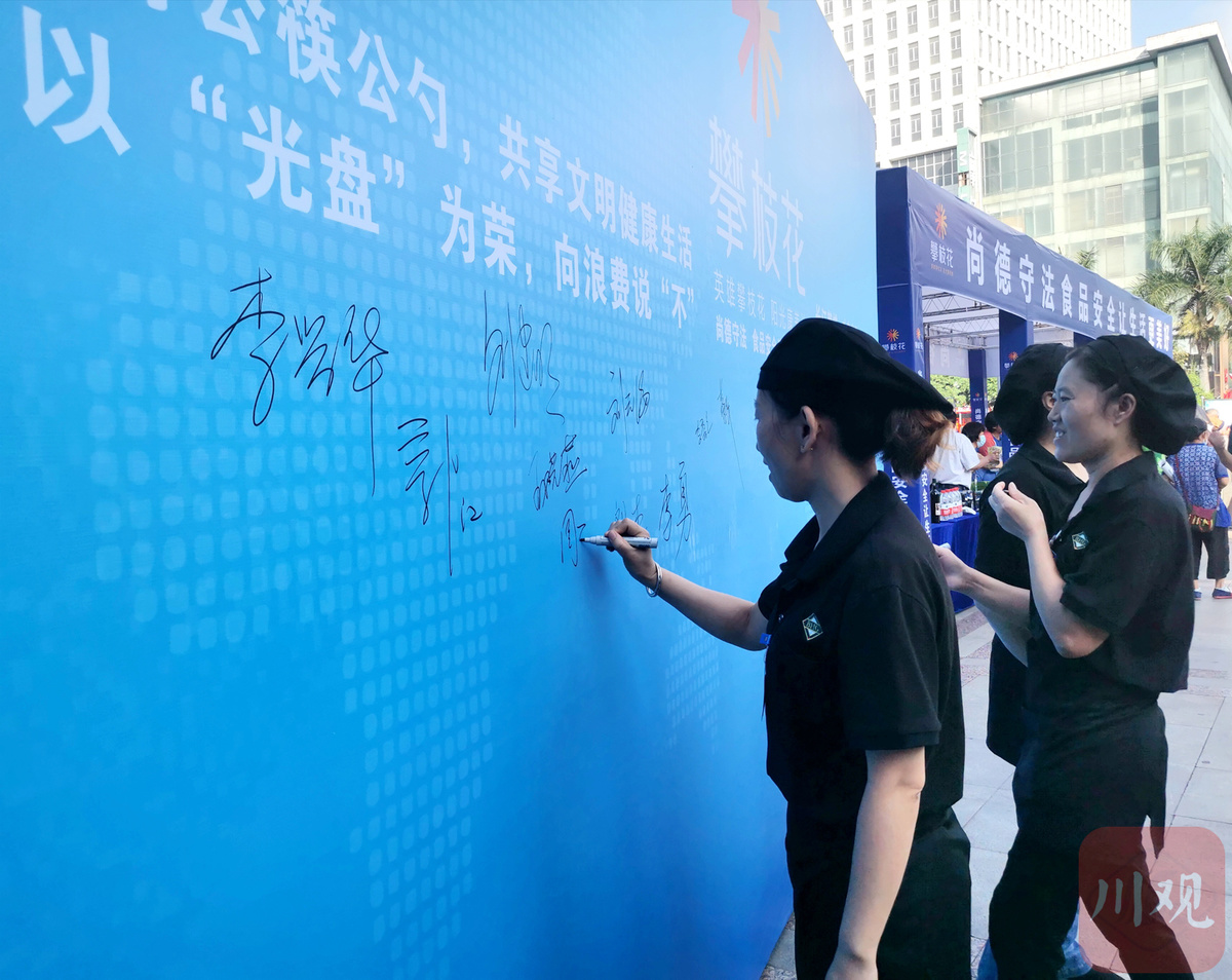 “舌尖上的安全”,需要共同守护。当天,攀枝花食品生产经营企业、行业协会、群众代表在保障食品安全、制止餐饮浪费、长江禁捕、禁食野生动物、推行公筷公勺承诺墙上签字,全力支持食品安全工作。同时,攀枝花市场监管、农业农村、公安等10余个食品安全成员单位共同参与,开展宣传咨询、投诉受理、食品快检演示、有奖知识问答,宣传食品安全科普知识,维护消费者自身合法权益。