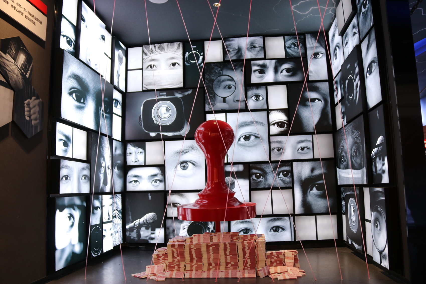 在展陈设计中,沉浸体验是最大特点。充分利用互动式空间场景,让参观者身临其境,在研学感悟中受到警示教育,如展厅内以第一人称视角、互动式空间场景,讲述了一名干部走向不归路的故事,通过“课桌—书桌—餐桌—办公桌—麻将桌—谈话桌”等场景切换,真实呈现“一念之差”前后的巨大反差。