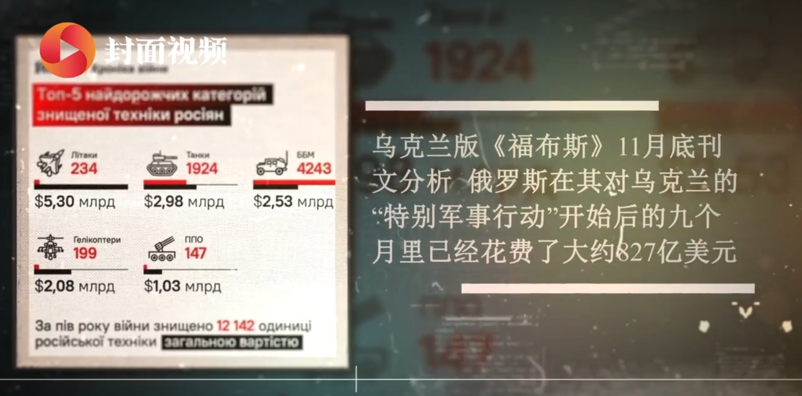 乌克兰版《福布斯》11月底刊文分析,俄罗斯在其对乌克兰的“特别军事行动”开始后的九个月里已经花费了大约827亿美元。