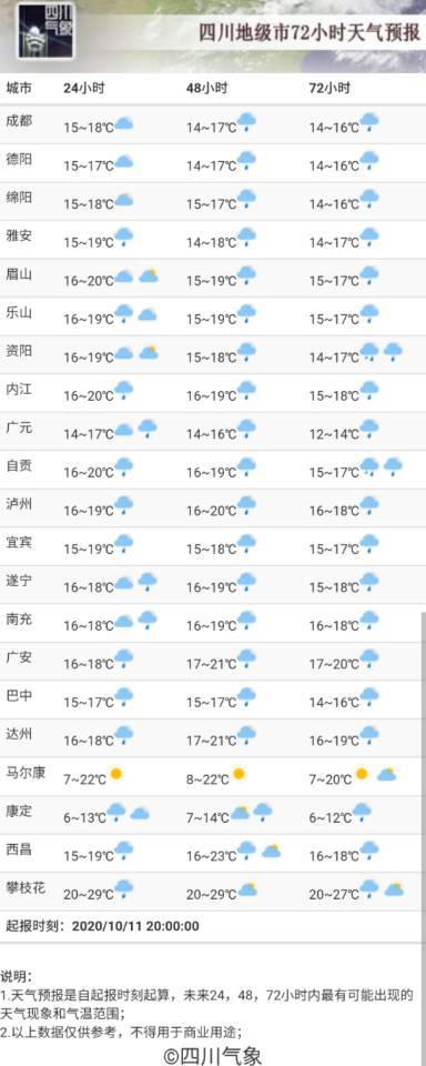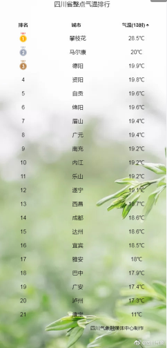 其中,南充、乐山气象台预计,周一到周三,当地最高气温将下降3℃左右;而宜宾虽然阴天有小雨,最高气温预计还维持在20~21℃。